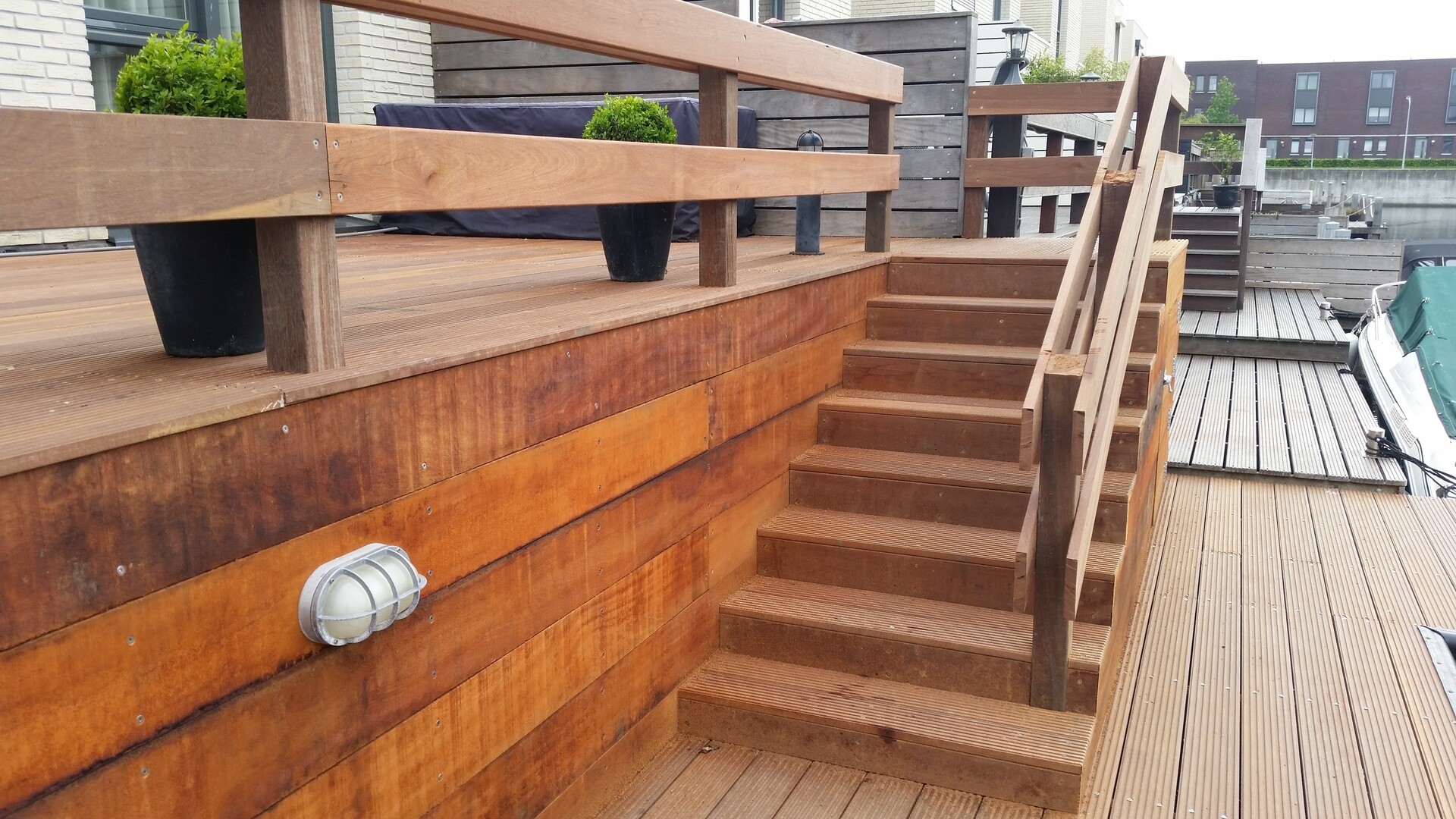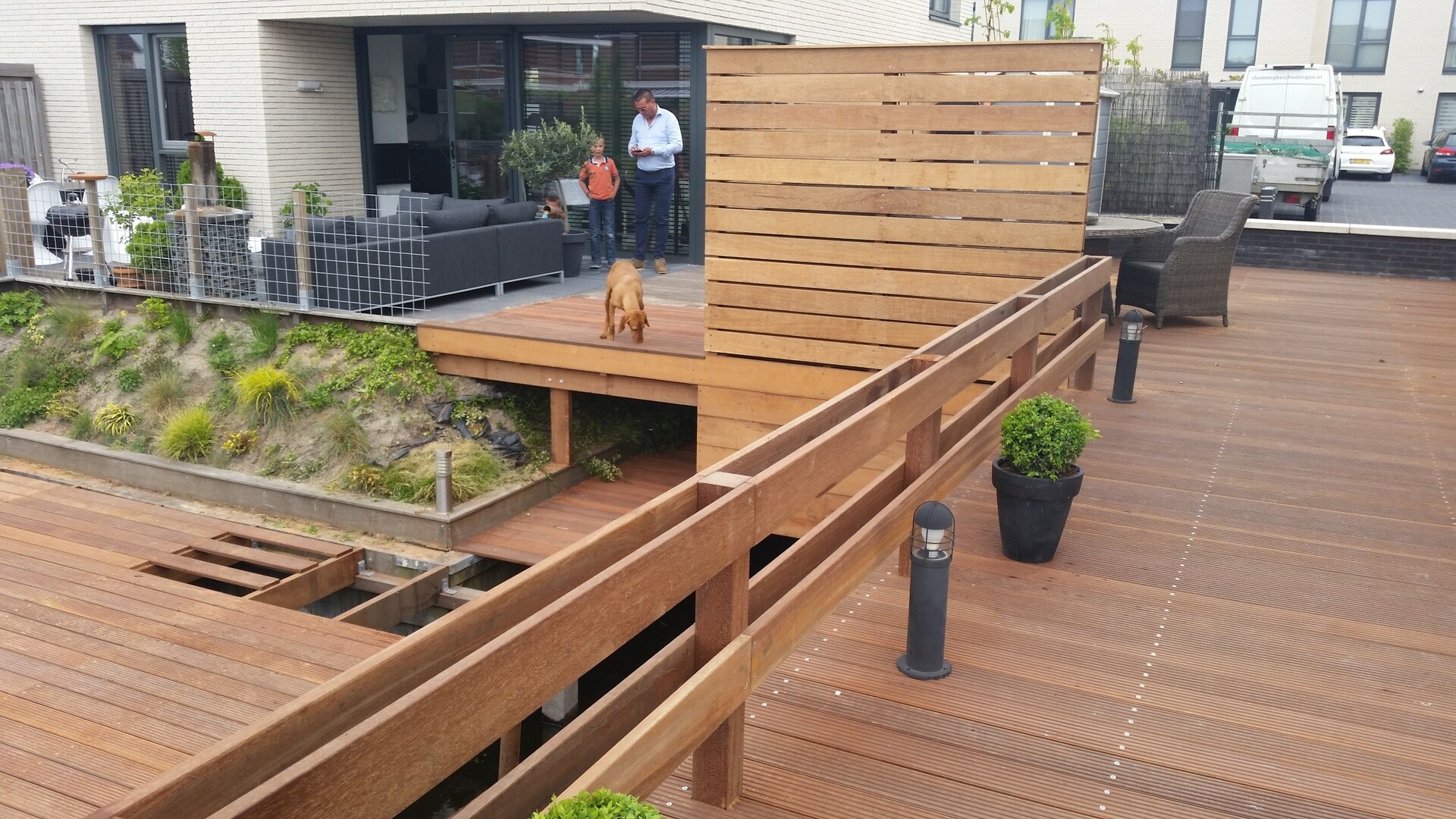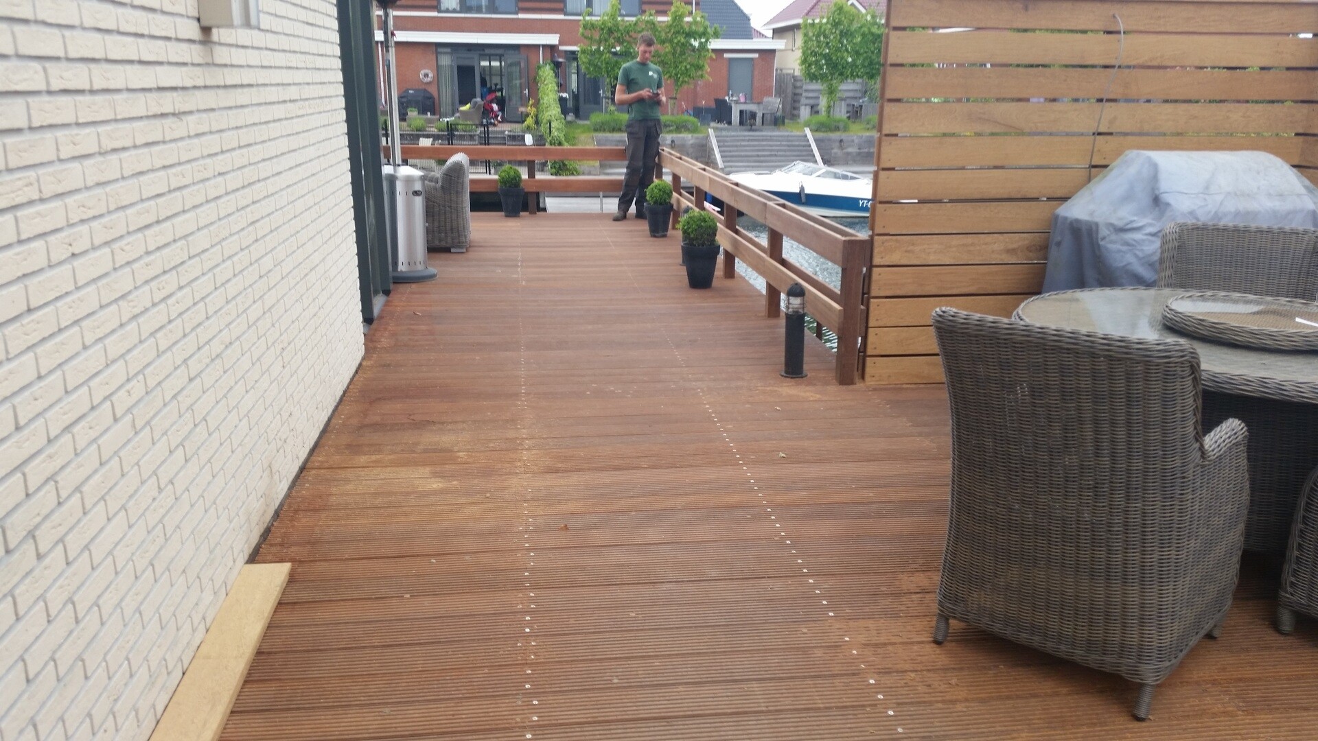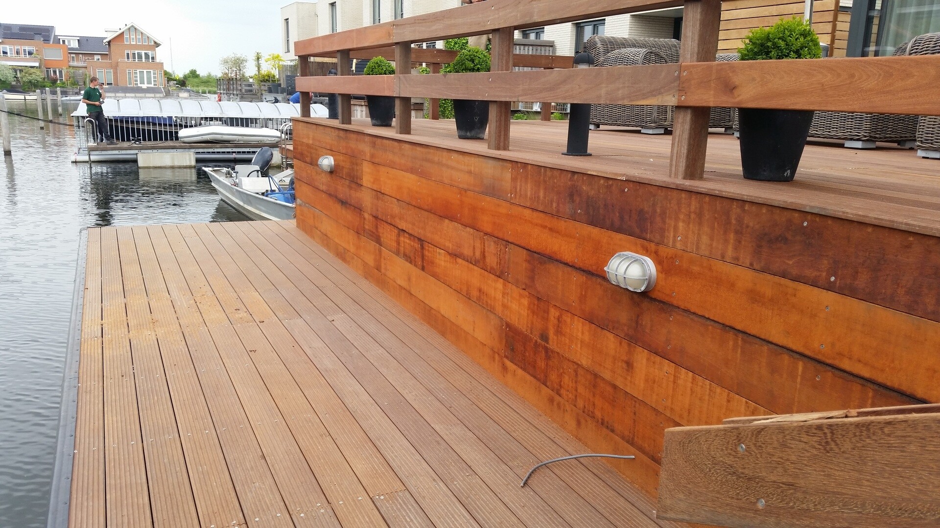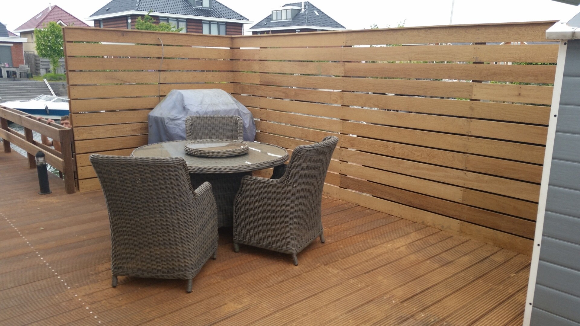 Bij dit project waren er twee extra wensen van de opdrachtgever: 1) Extra privacy als ze buiten zitten 2) Voorkomen van wegwaaiende tuinmeubels. Voor de extra privacy heeft Slootweg een schutting ontworpen en gemaakt van hetzelfde hardhout als de steiger. Door de planken aan beide zijdes op dezelfde hoogte te houden, heb je wel het gevoel dat je dicht bij het water zit,. Maar de langsvarende mensen kunnen niet met je meekijken. De tweede wens is er één die de laatste tijd steeds vaker voor komt. De wind in Nederland wordt steeds krachtiger waardoor meubels op een steiger sneller gaan verplaatsen. De oplossing hiervoor is een extra leuning. Mocht een tuinstoel worden verplaatst door de wind, dan wordt deze in ieder geval tegengehouden door het hek. Het tuinmeubilair zal nu dus niet zo snel in het water verdwijnen.