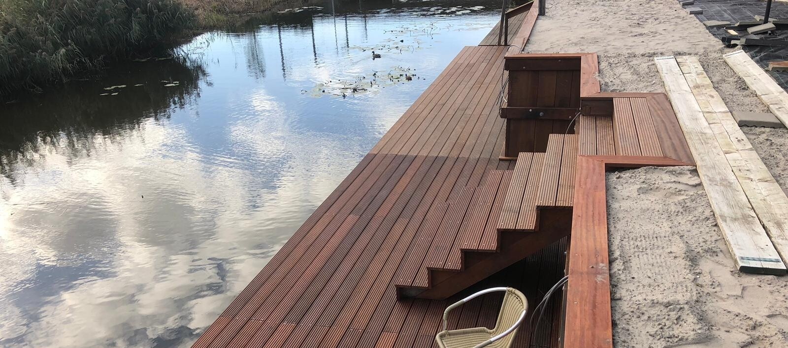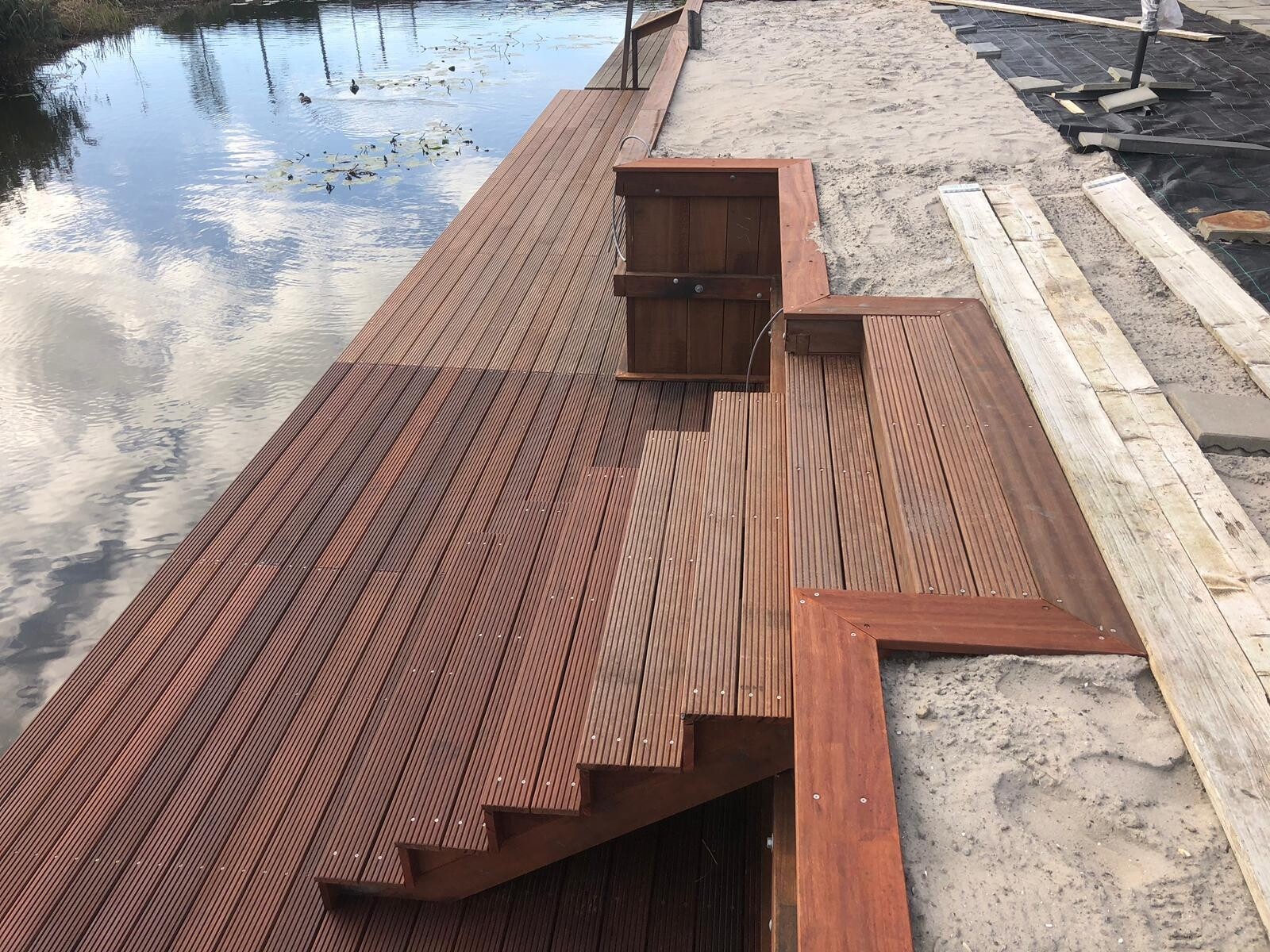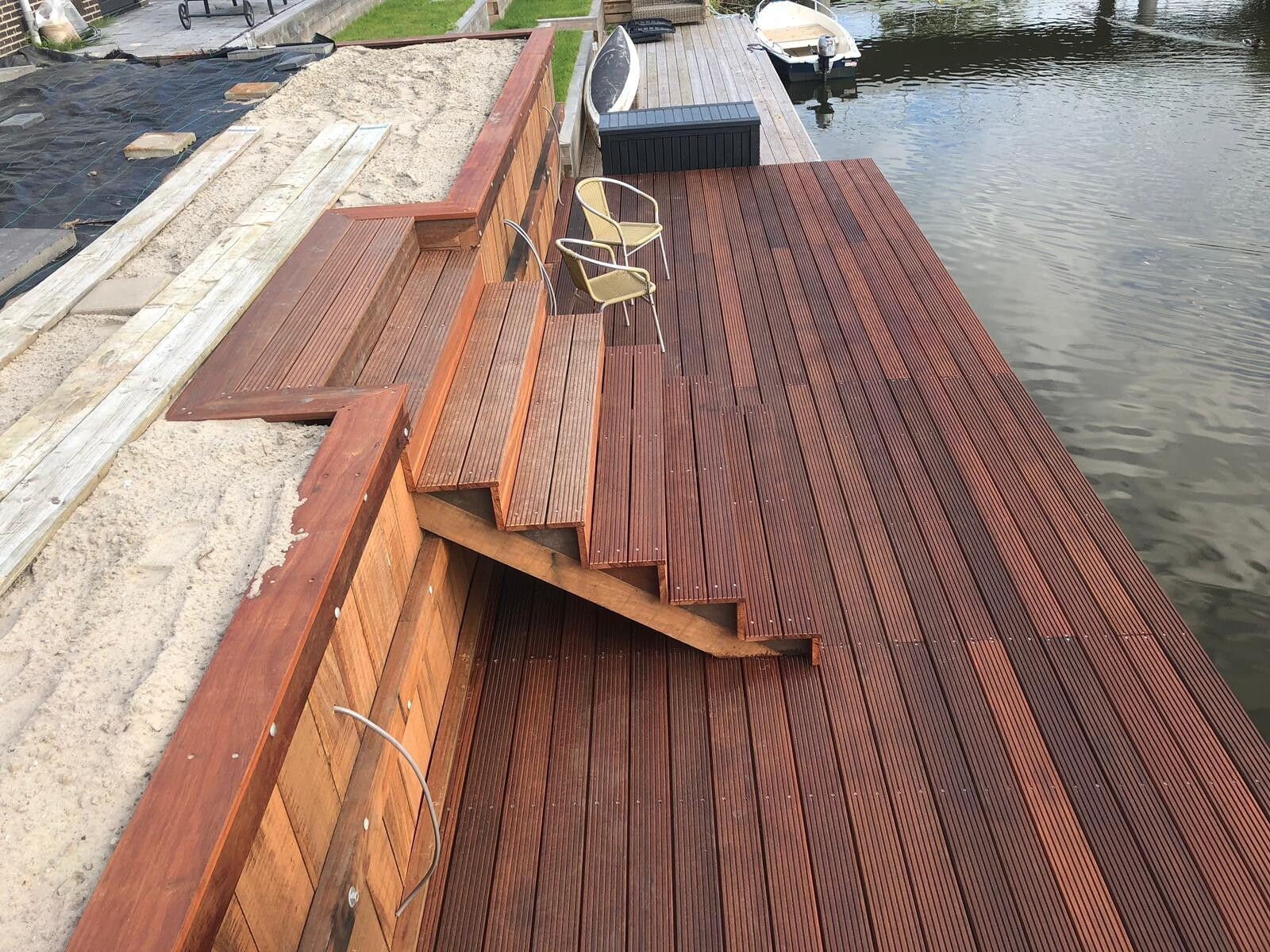 Bij twee tuinen in Almere hebben wij damwanden geplaatst om meer tuin op de hoogte van de woonkamer te creëren. Daarnaast hebben we een steiger met zitplaats aangelegd.