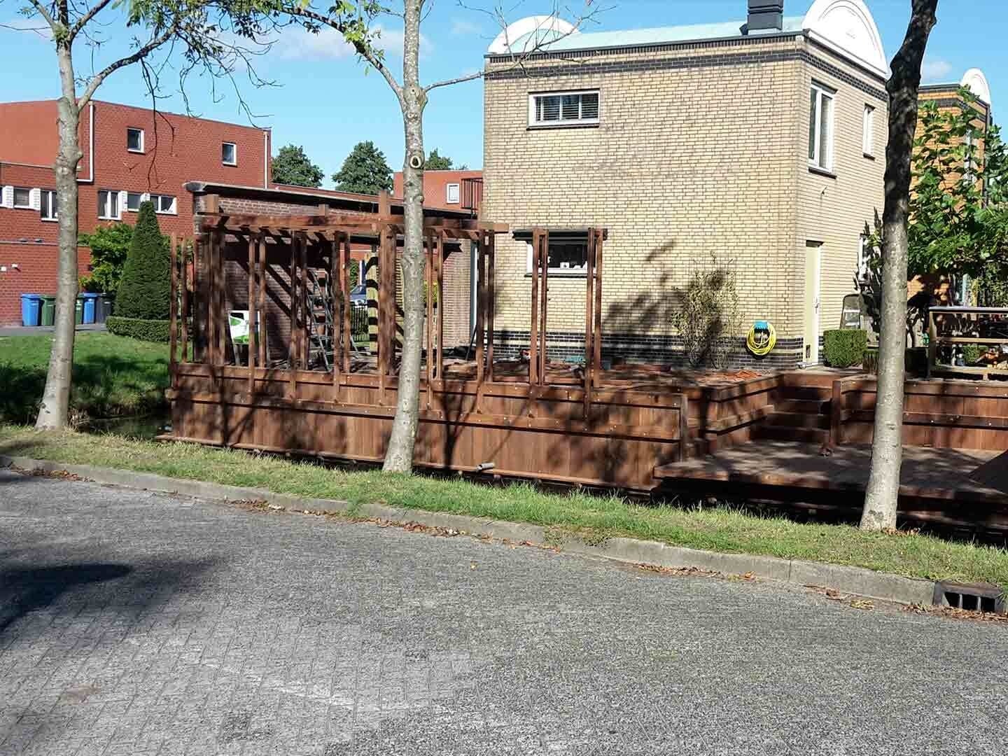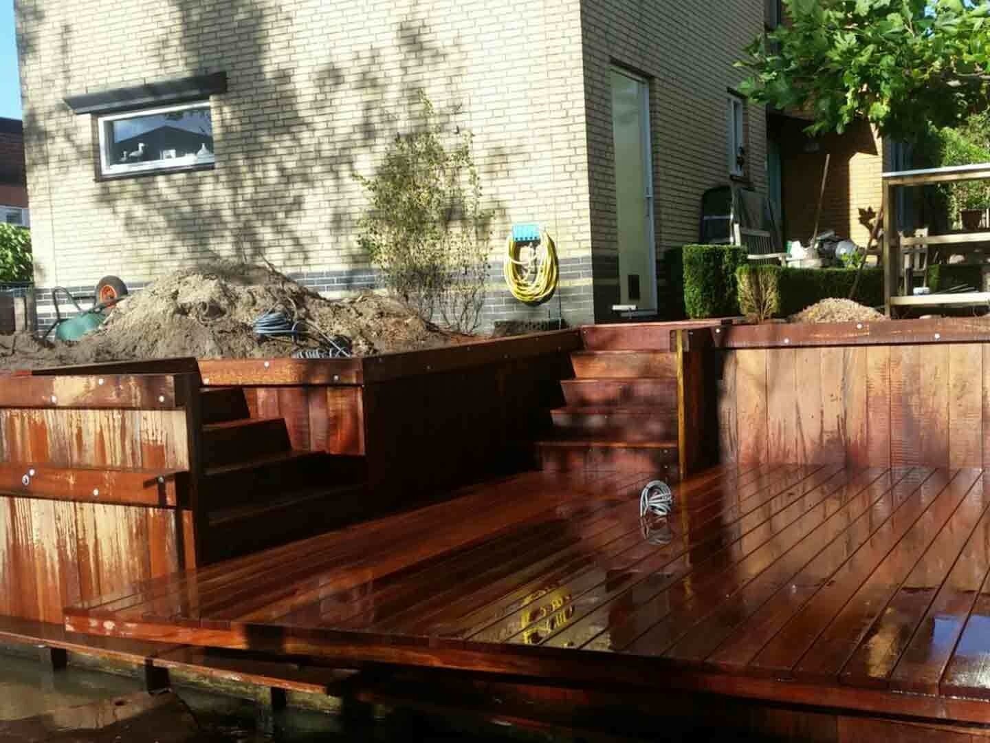 Om de moderne en degelijke uitstraling te realiseren, hebben we gekozen voor Azobe hout. Dit is een duurzame houtsoort en is perfect voor zware constructies. En laten we dat nu net moeten bouwen in deze tuin.
