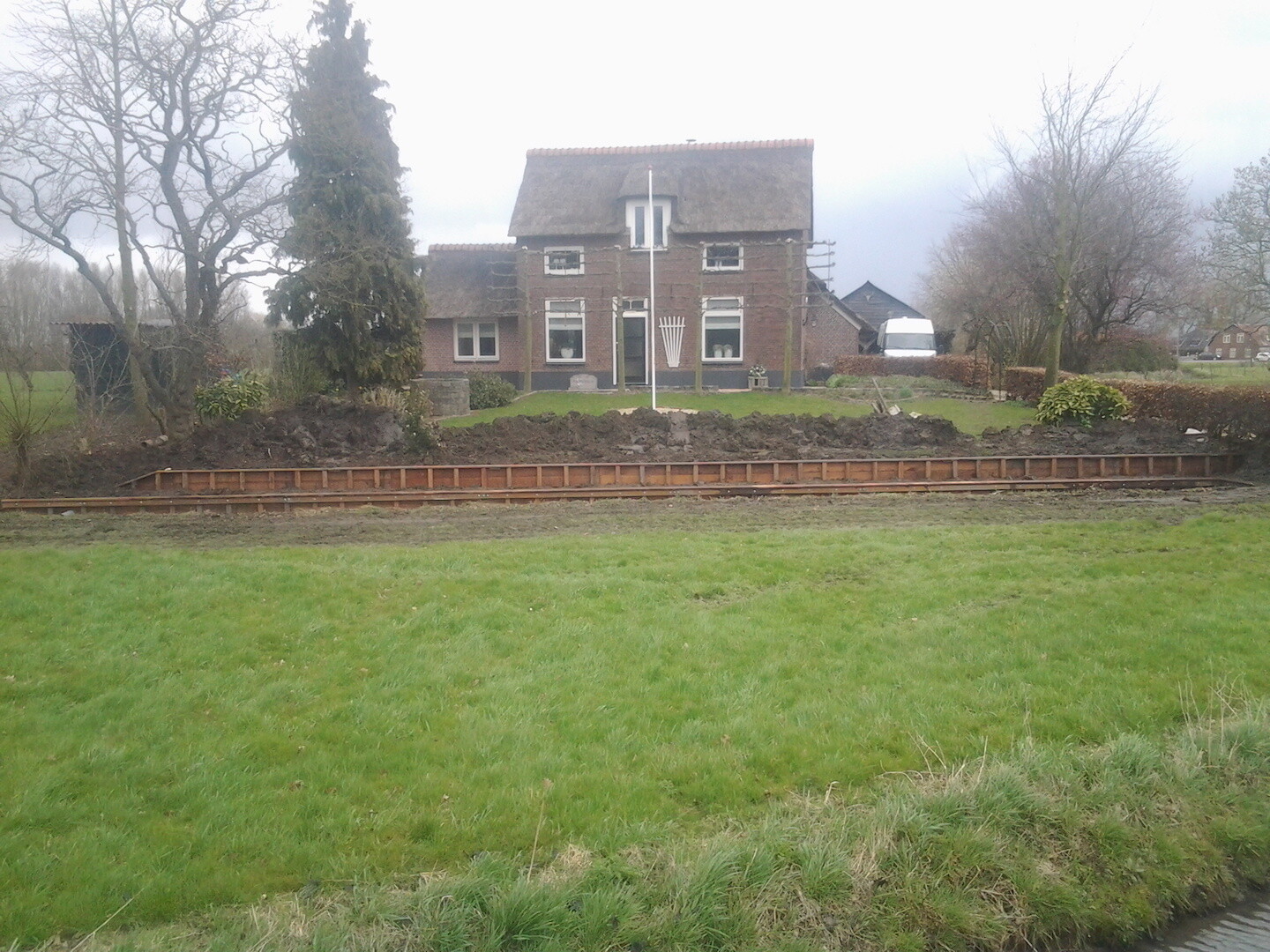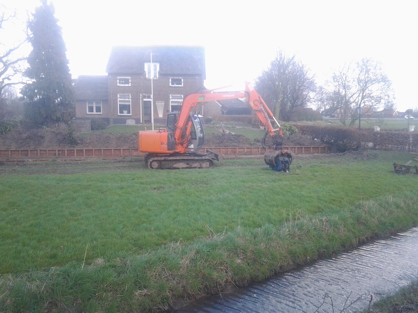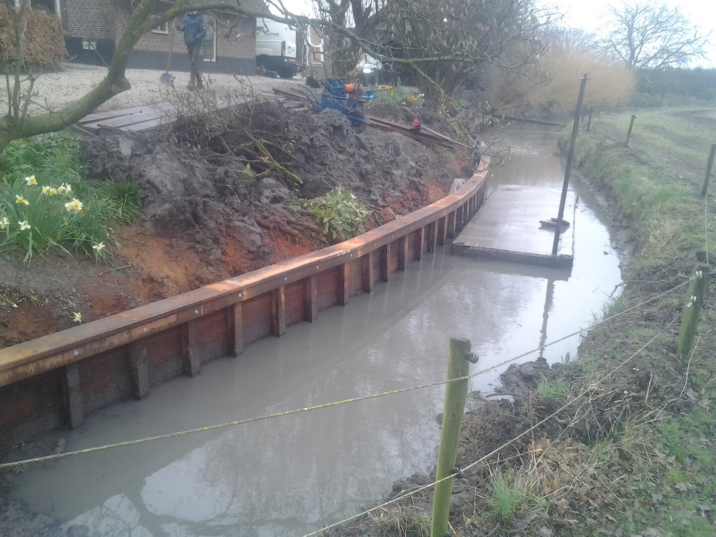 Via het weiland van de boer naast onze klant, mochten we werken aan deze beschoeiing. Wat een enorm voordeel was, want zo beschadigden we de tuin zo min mogelijk. Waardoor er geen herstelwerkzaamheden nodig waren.