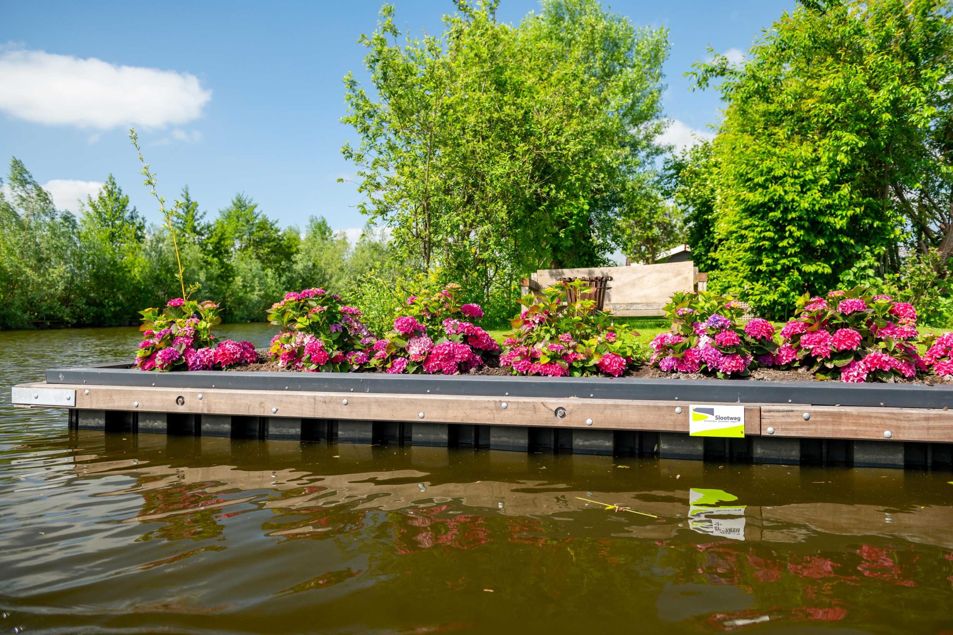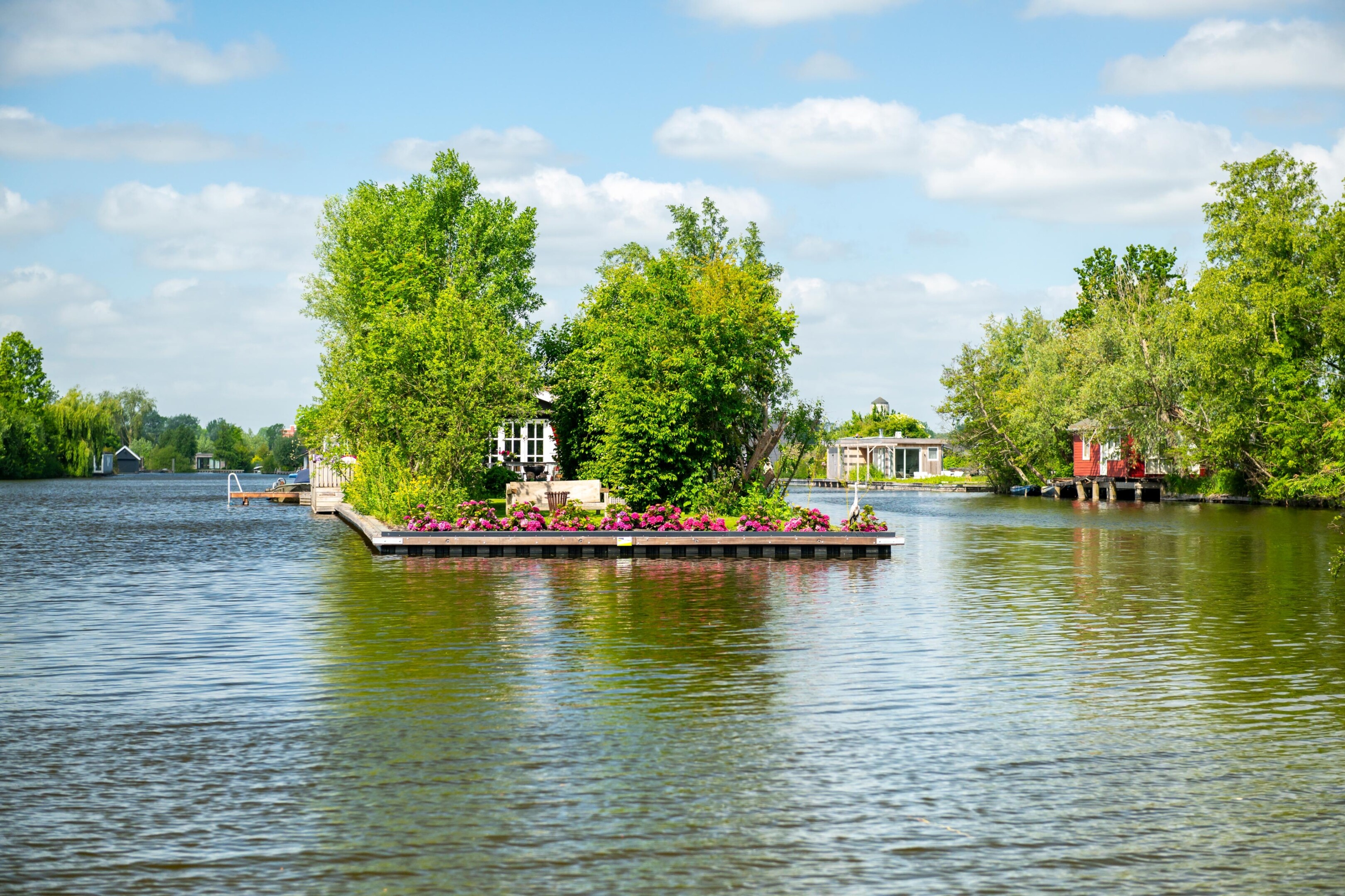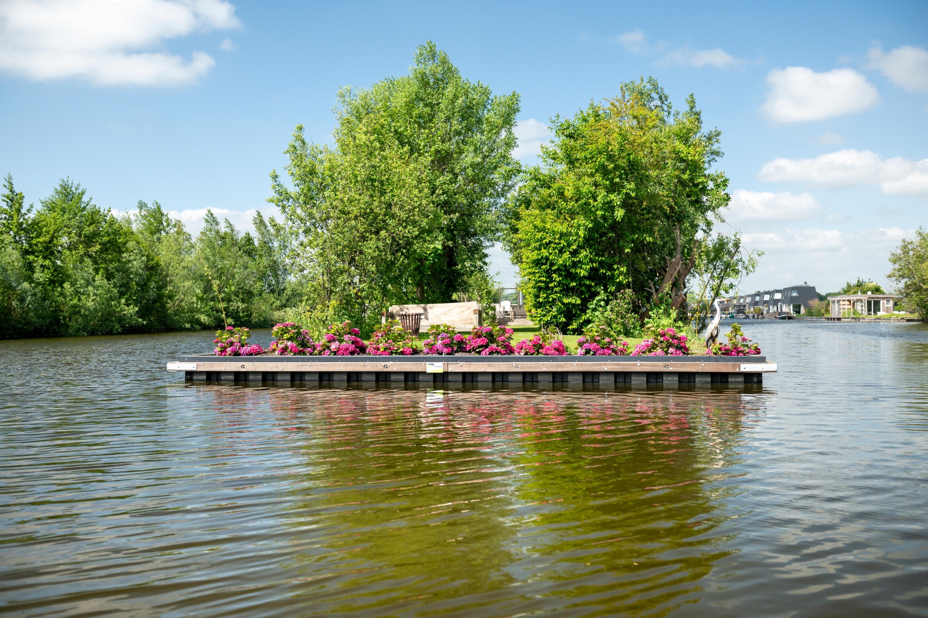 De kunststof damwand rond dit eiland is afgewerkt met een duurzame deksloof. Een deel van de steigers is vervangen en het terrein is opgehoogd met natuurlijke materialen. Na het egaliseren is het eiland ingezaaid, klaar voor intensief gebruik en behoud van kwaliteit op lange termijn.