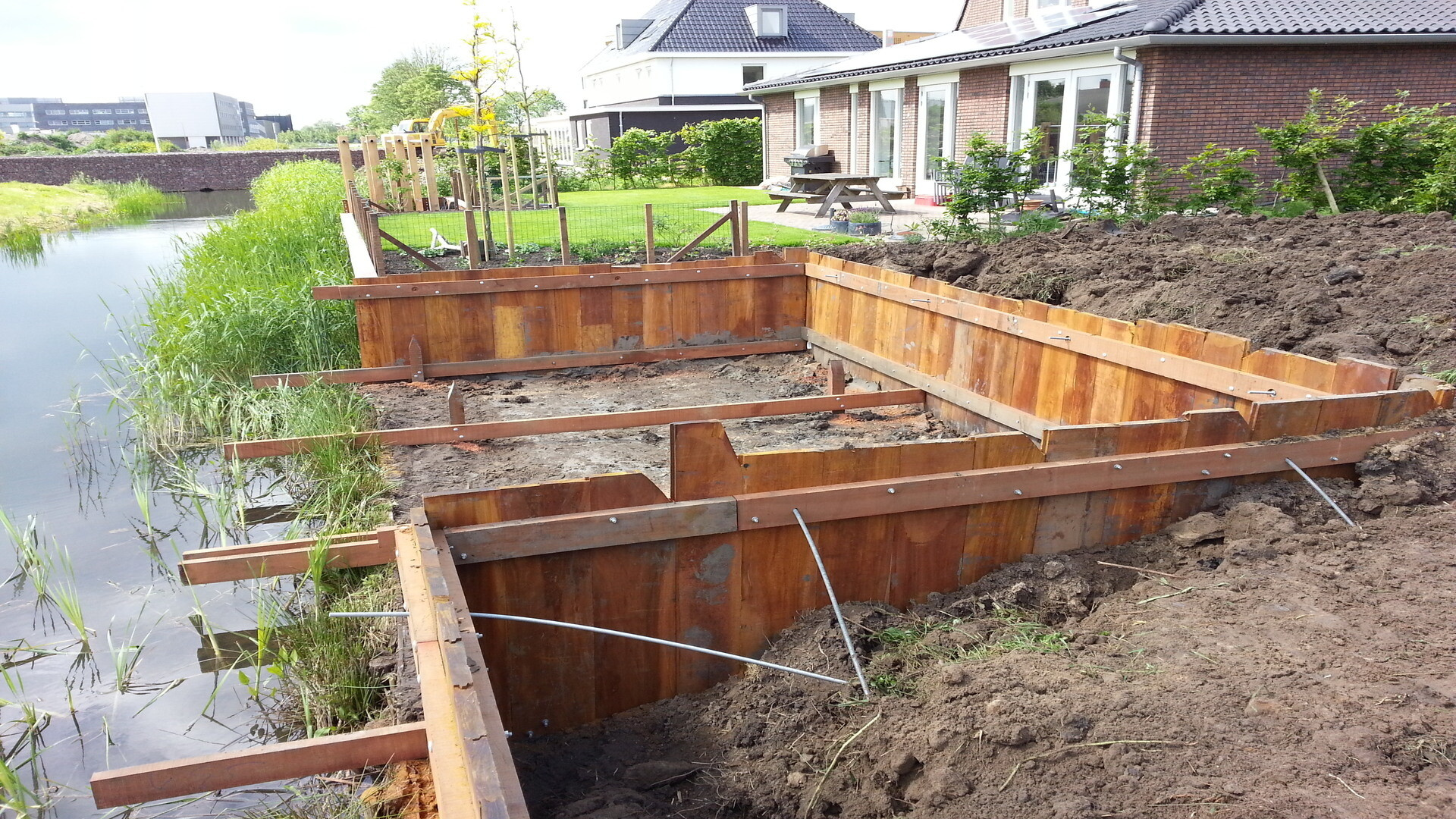 In Nieuwegein moest een nieuw huis worden gebouwd en de eigenaar wilde langs de sloot een houten damwand met een vlonder. De uitdaging zat dit keer vooral in het goed afwerken van de damwand zodat de tuin later nog goed aangelegd kond worden.