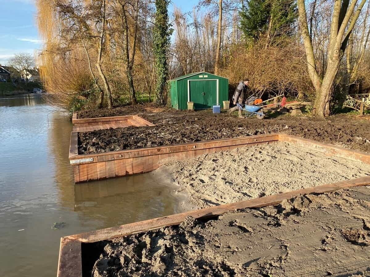 Naast het plaatsen van de damwanden had deze klant ook de wens voor een inham met strandje. Dit hebben wij ook opgepakt en het resultaat kan u zien in de foto's.