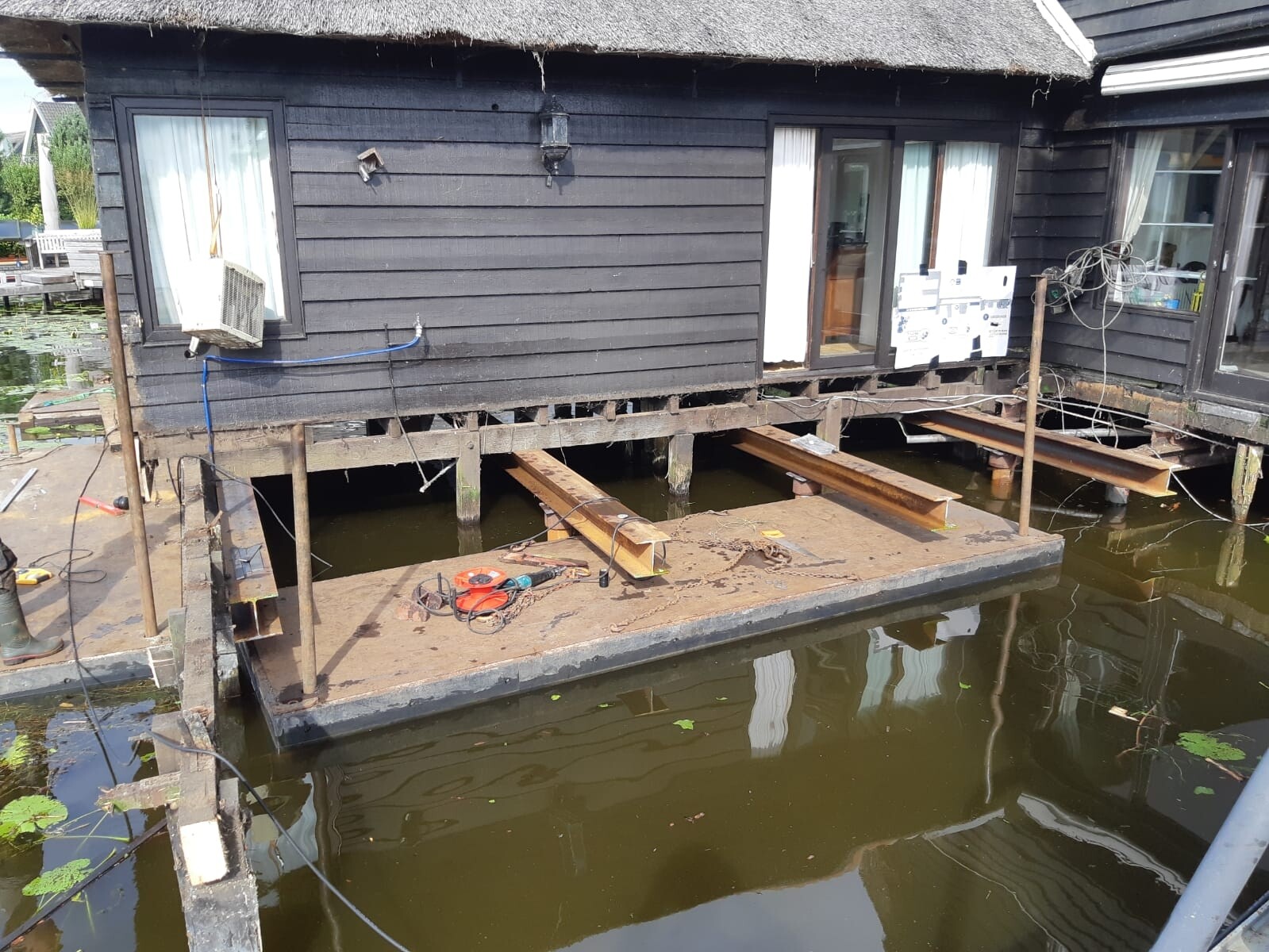 In Loosdrecht werkten we aan een houten woning met een aanbouw die dringend toe was aan funderingsherstel. De oude houten palen bleken in slechte staat – geen betrouwbare basis meer voor de constructie. Daarom zijn er nieuwe stalen buispalen geheid, met stalen balken onder de aanbouw om het geheel weer stevig op te vangen.