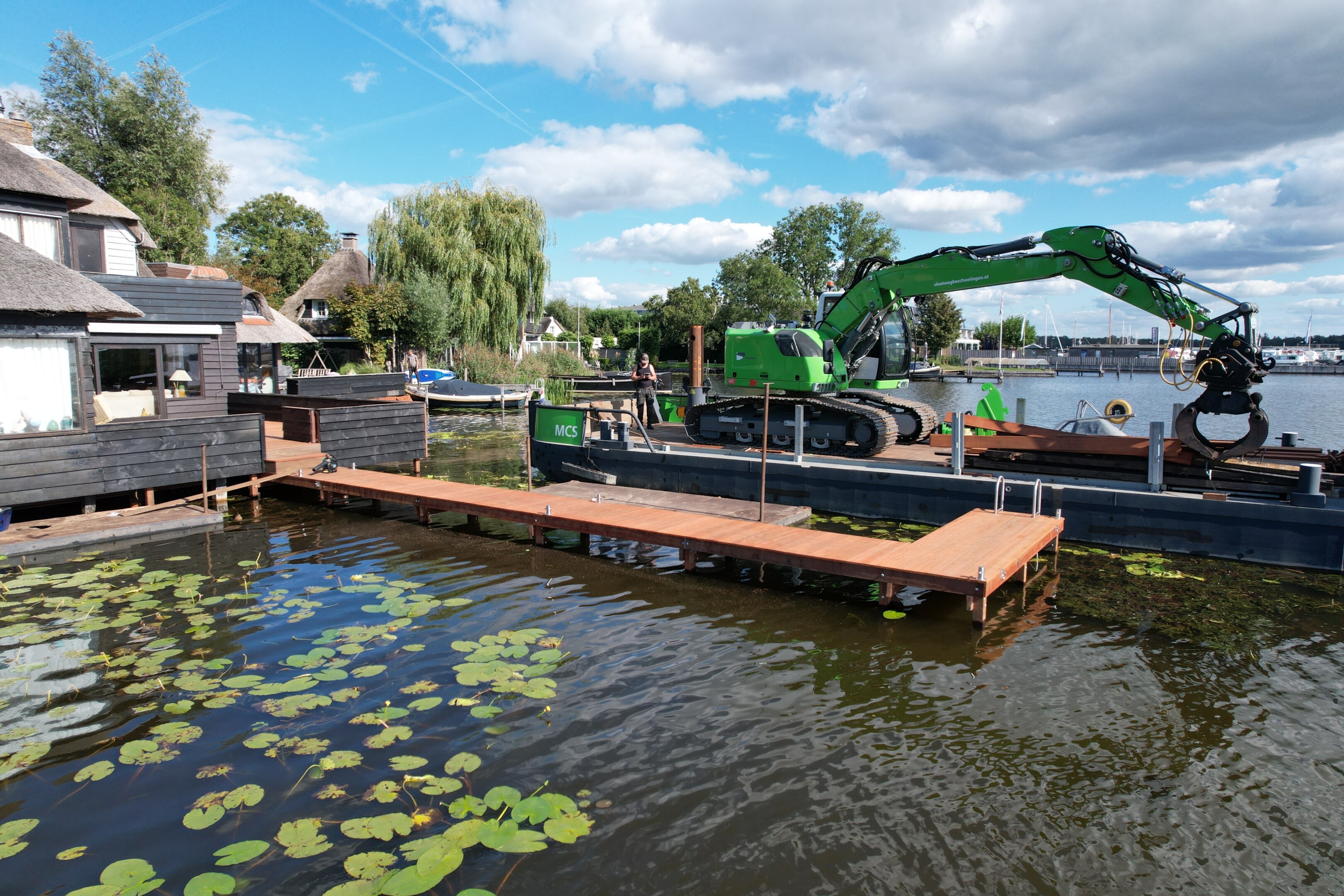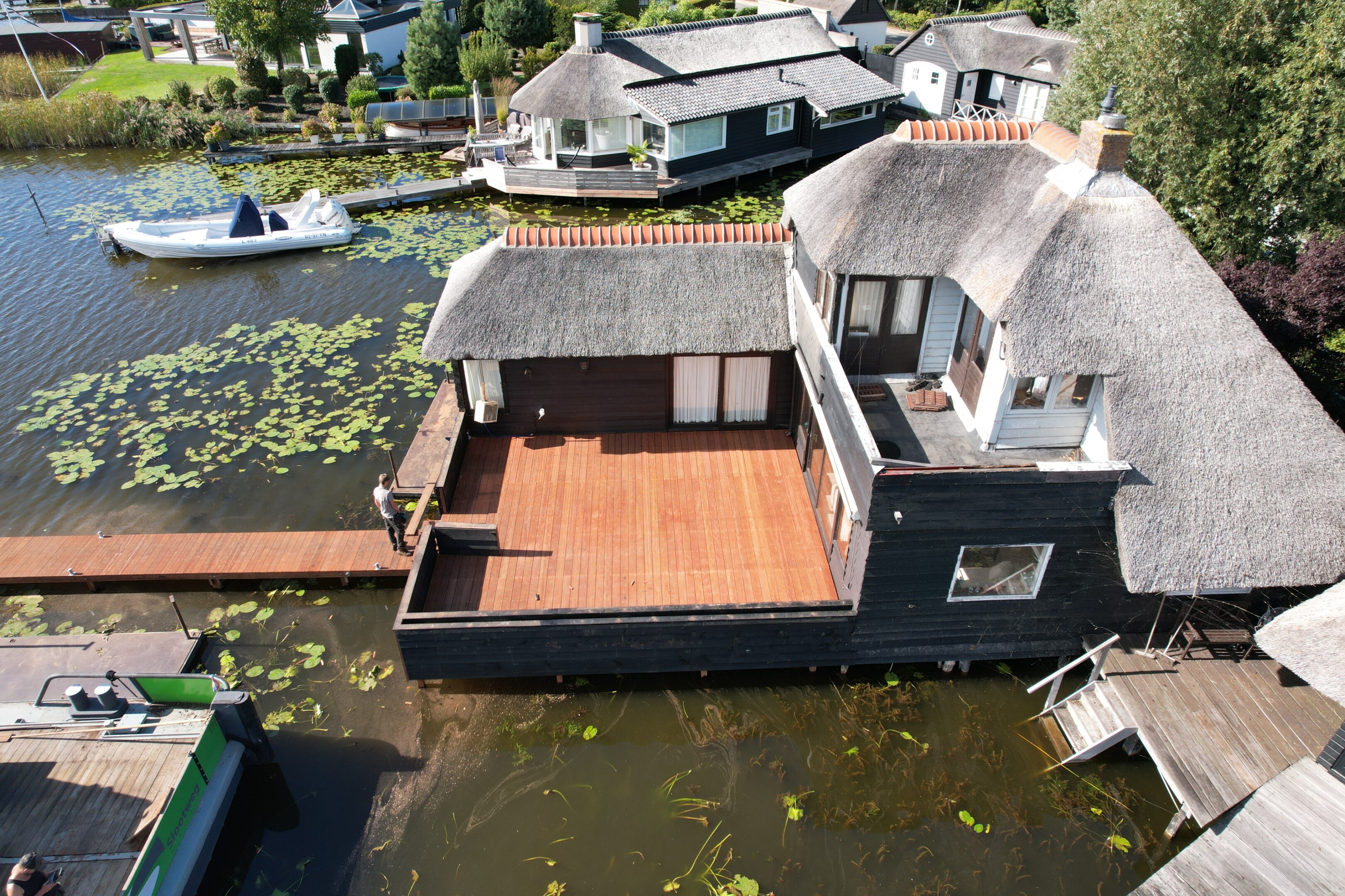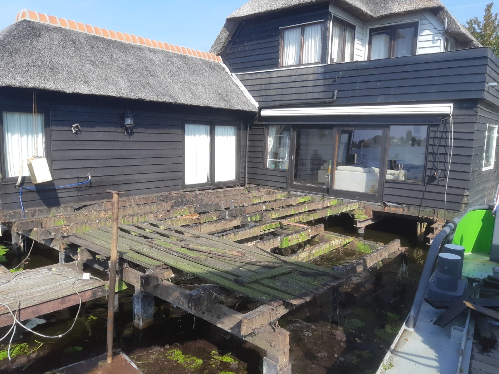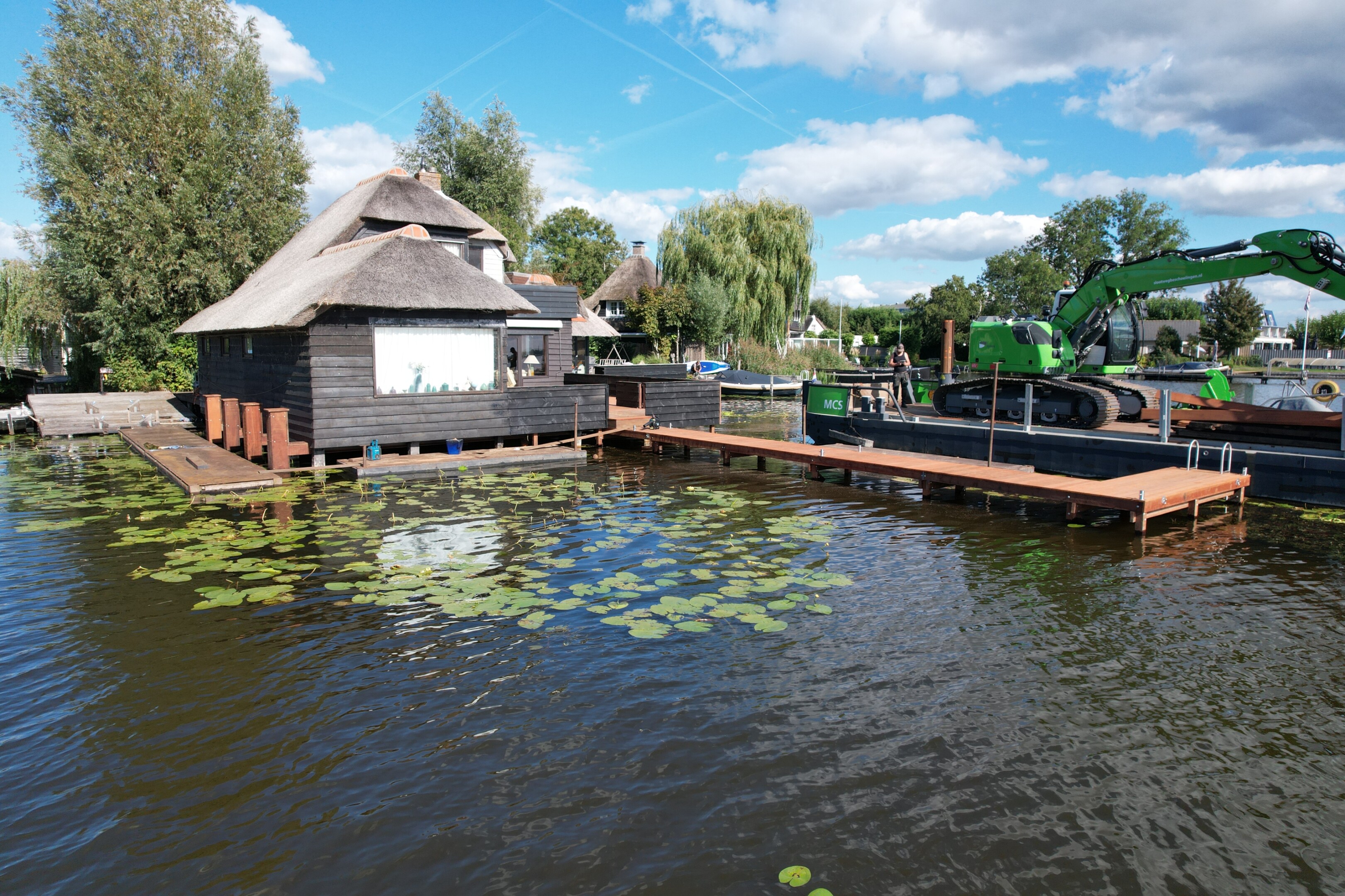 Tegelijkertijd pakten we ook het aangrenzende terras aan. Het bestaande terras en de steiger verkeerden in slechte conditie, en zijn volledig verwijderd. Daarna hebben we alles opnieuw opgebouwd, inclusief een nieuwe steiger het water in.