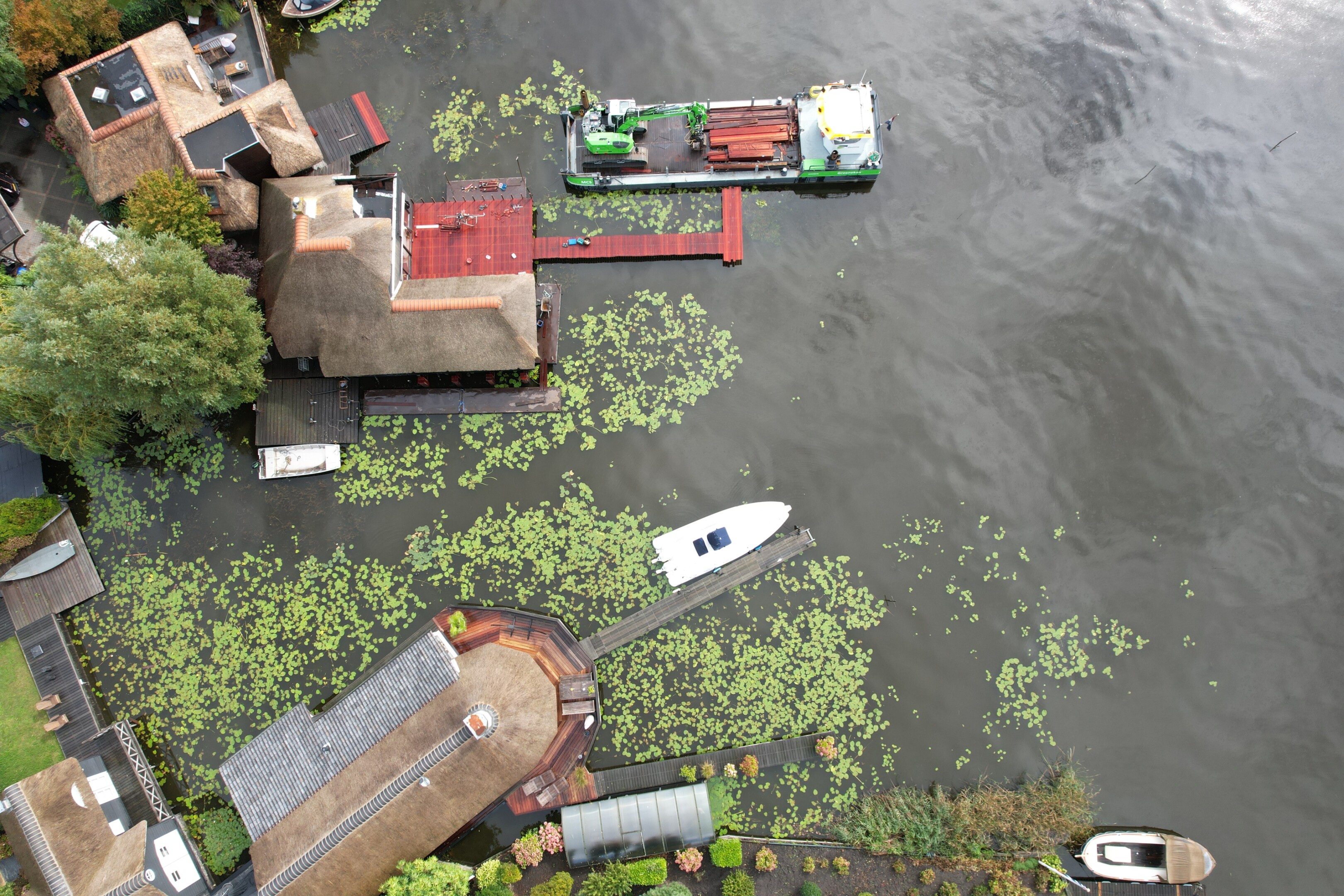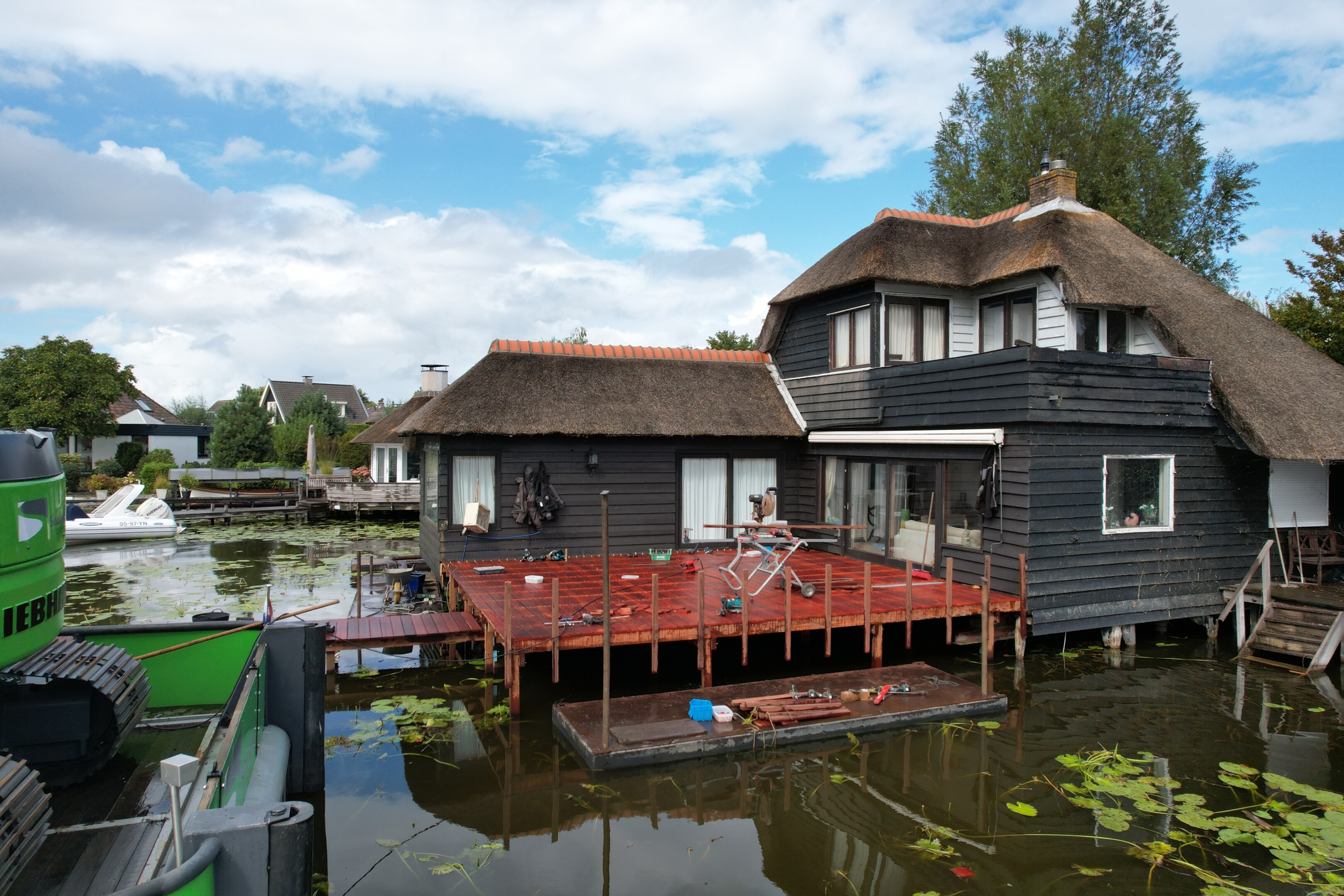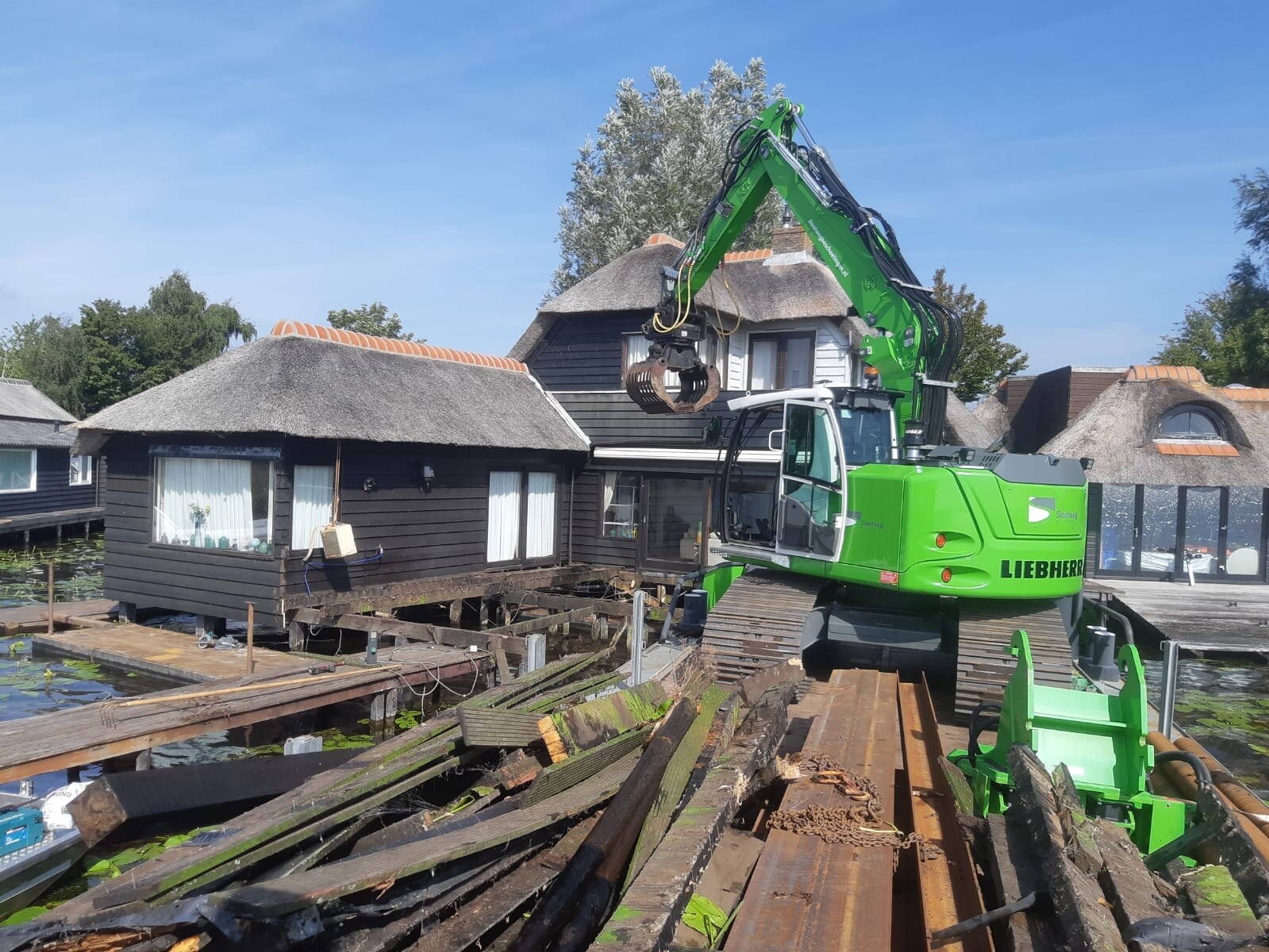 Tegelijkertijd pakten we ook het aangrenzende terras aan. Het bestaande terras en de steiger verkeerden in slechte conditie, en zijn volledig verwijderd. Daarna hebben we alles opnieuw opgebouwd, inclusief een nieuwe steiger het water in.