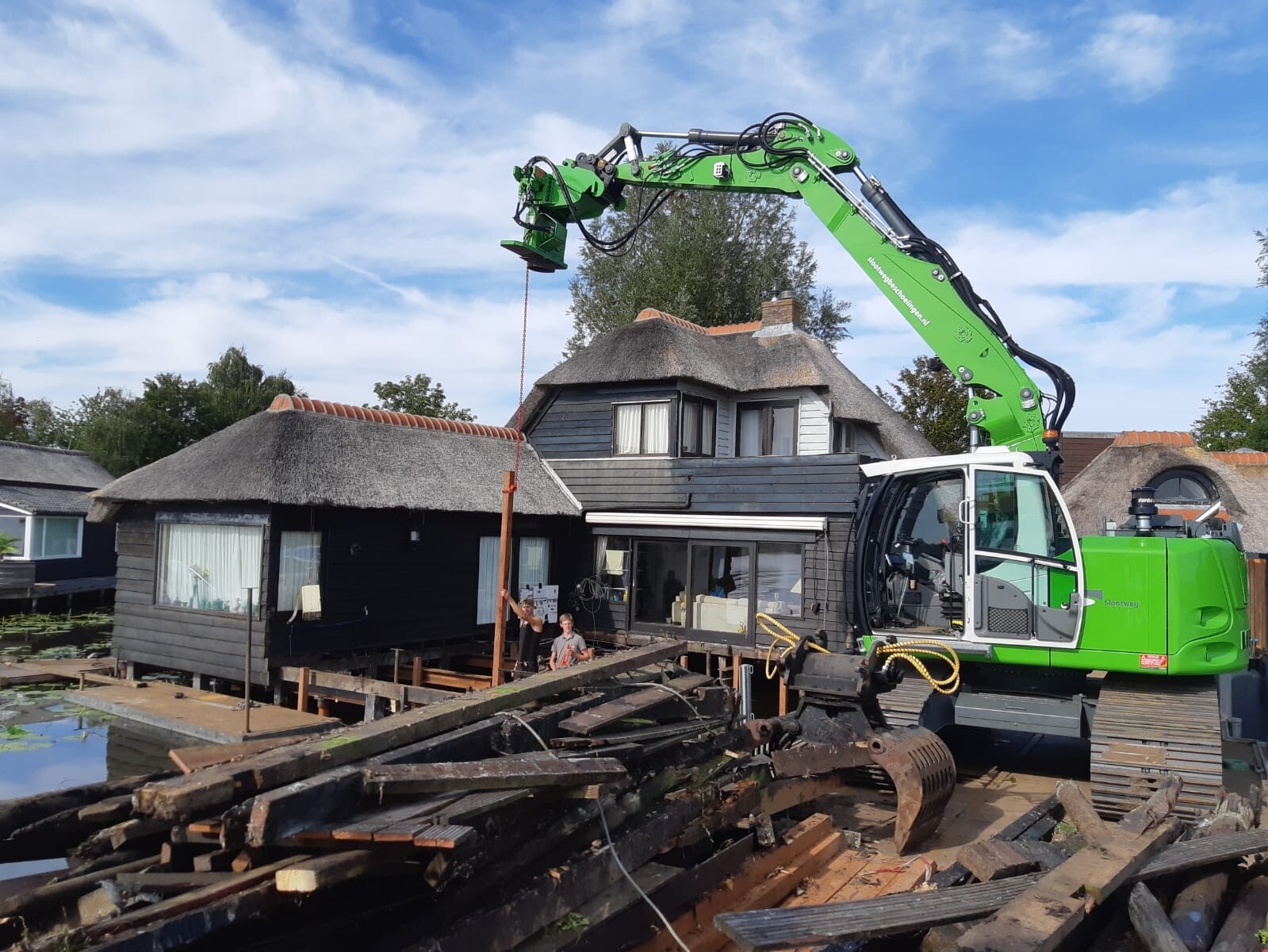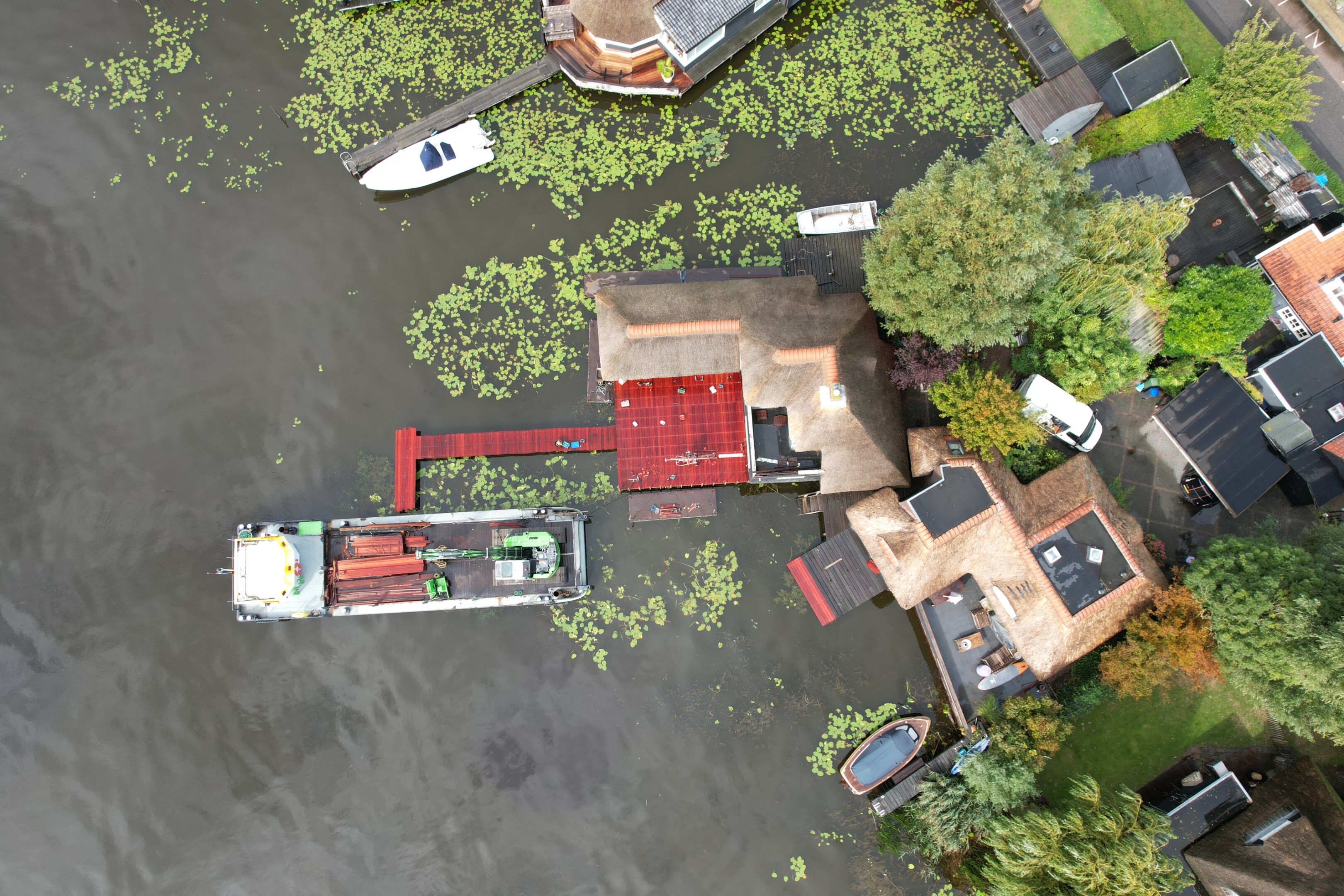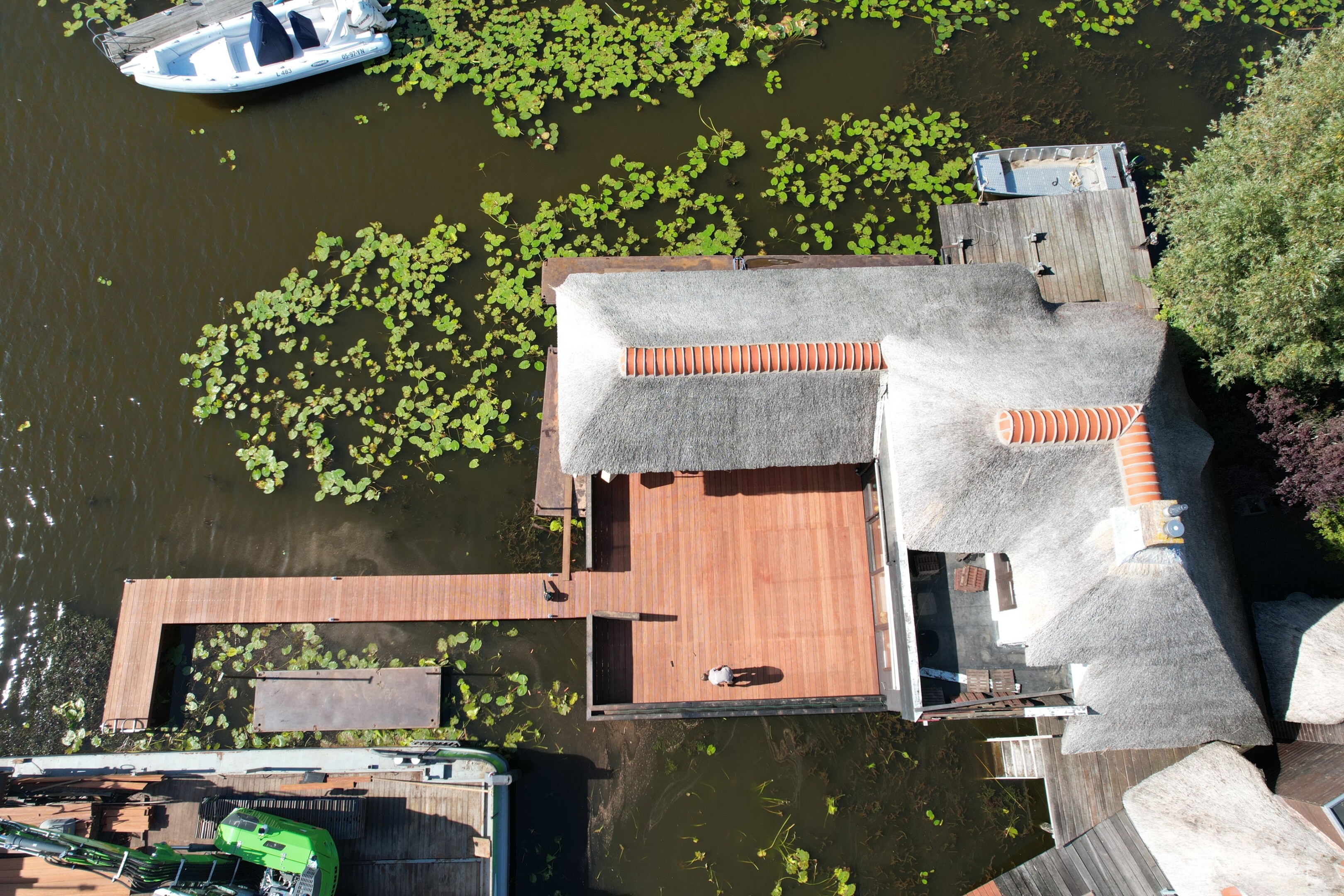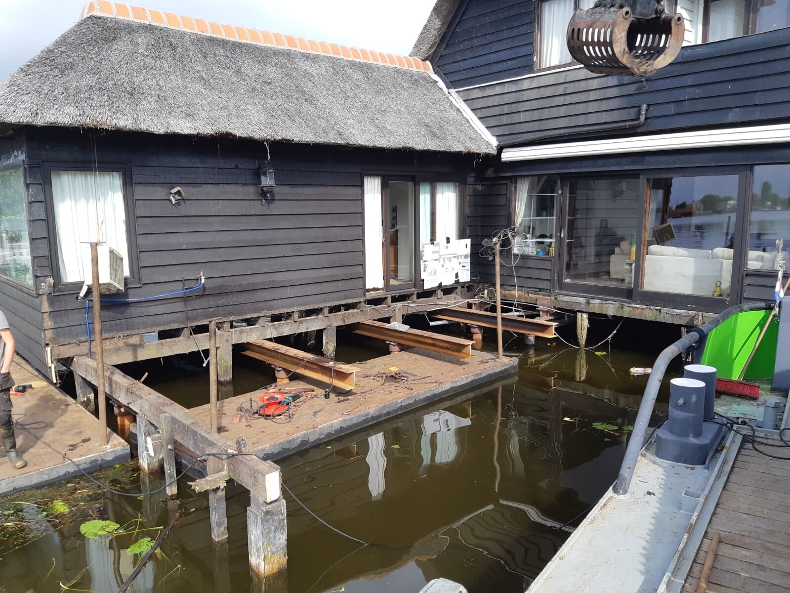 Tegelijkertijd pakten we ook het aangrenzende terras aan. Het bestaande terras en de steiger verkeerden in slechte conditie, en zijn volledig verwijderd. Daarna hebben we alles opnieuw opgebouwd, inclusief een nieuwe steiger het water in.