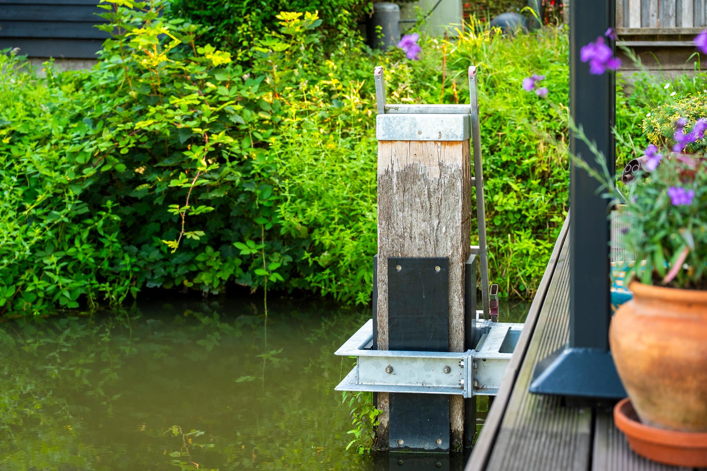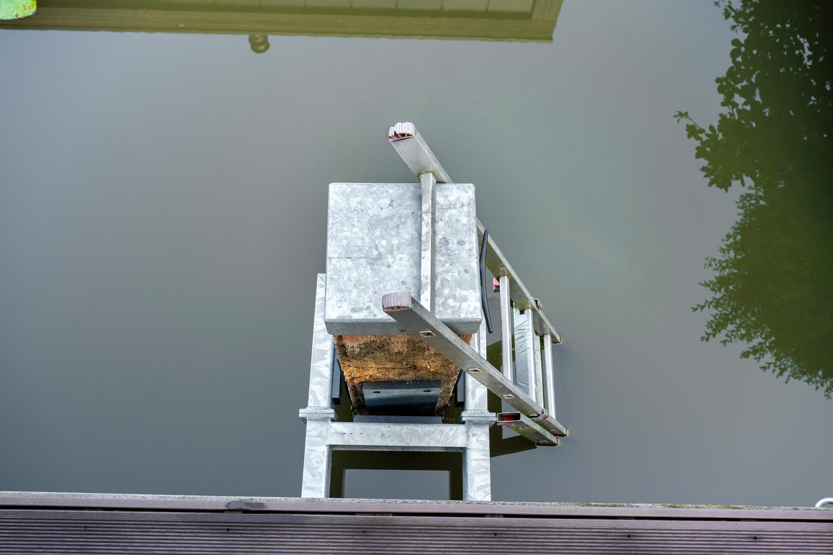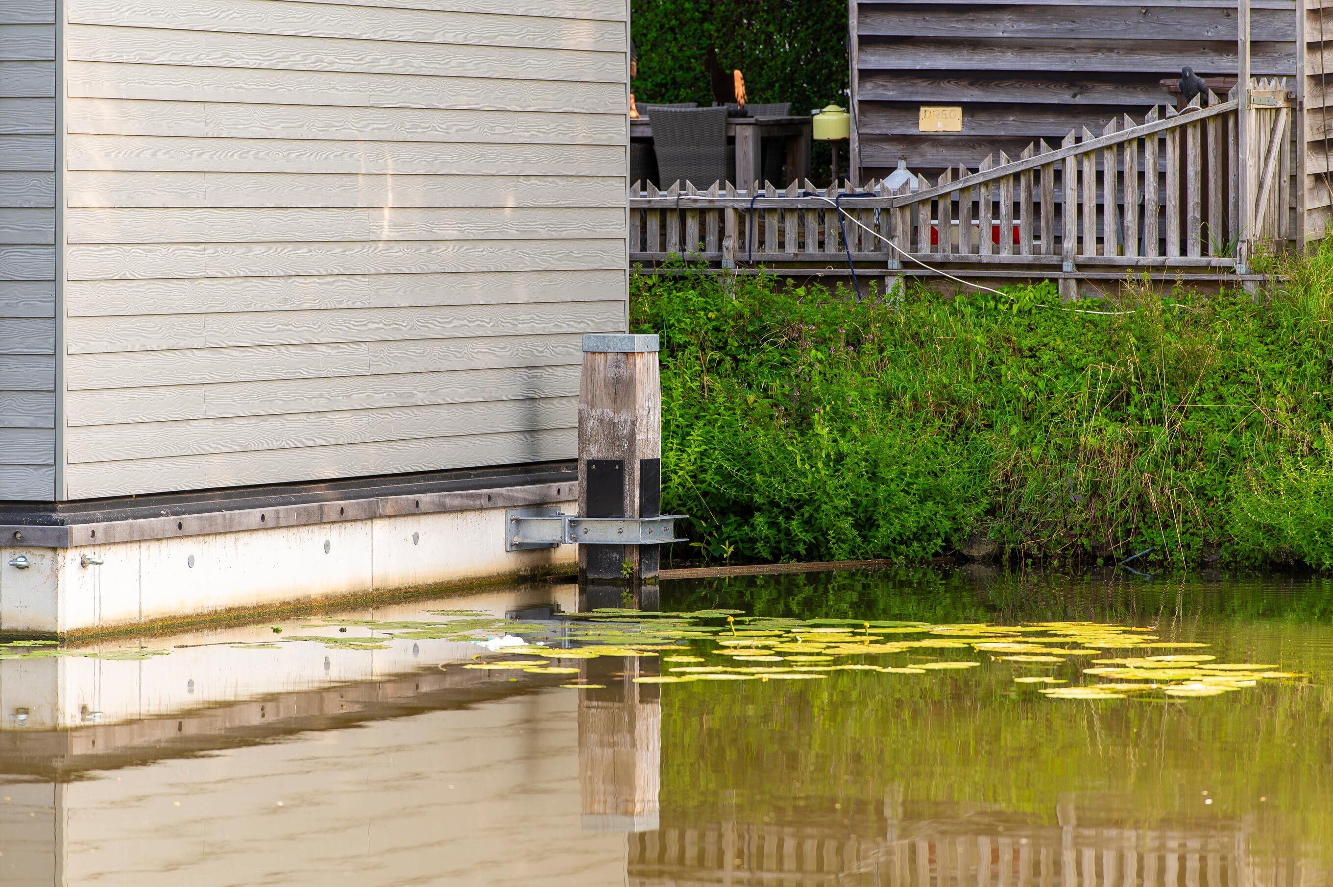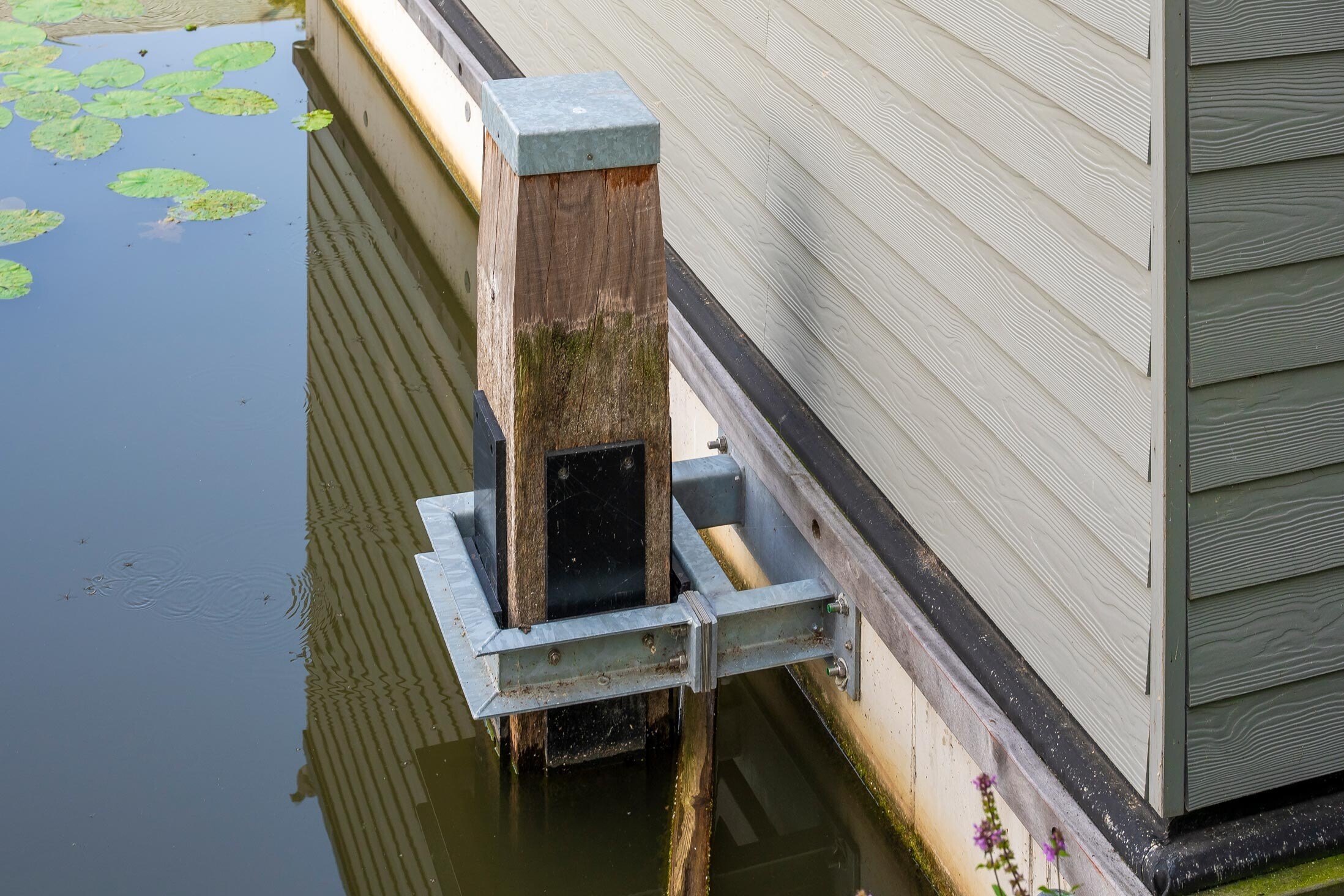 Voor drie nieuwe woonarken in Utrecht hebben we zware meerpalen van 30x30 cm en 10 meter lang geplaatst, inclusief een speciaal geleidesysteem. Dit laat de arken geleidelijk meebewegen met het wisselende waterpeil, zodat je daar binnen nauwelijks iets van merkt. De werkzaamheden zijn volledig vanaf het water uitgevoerd.