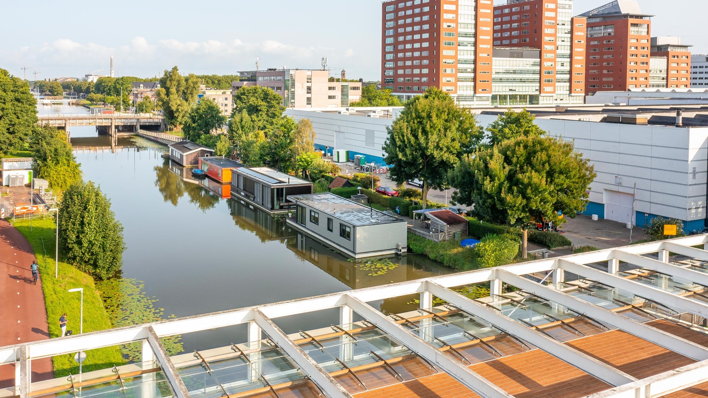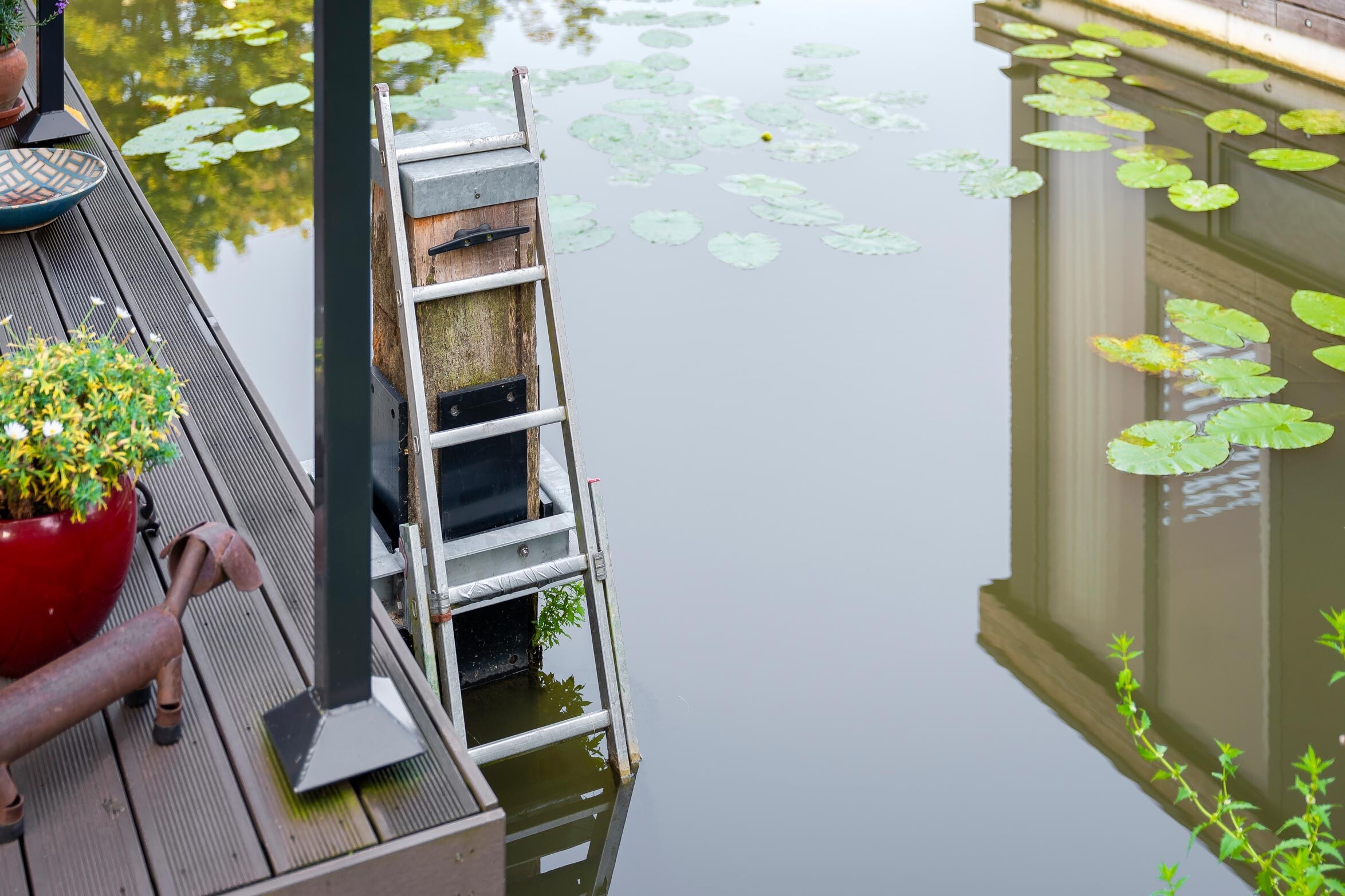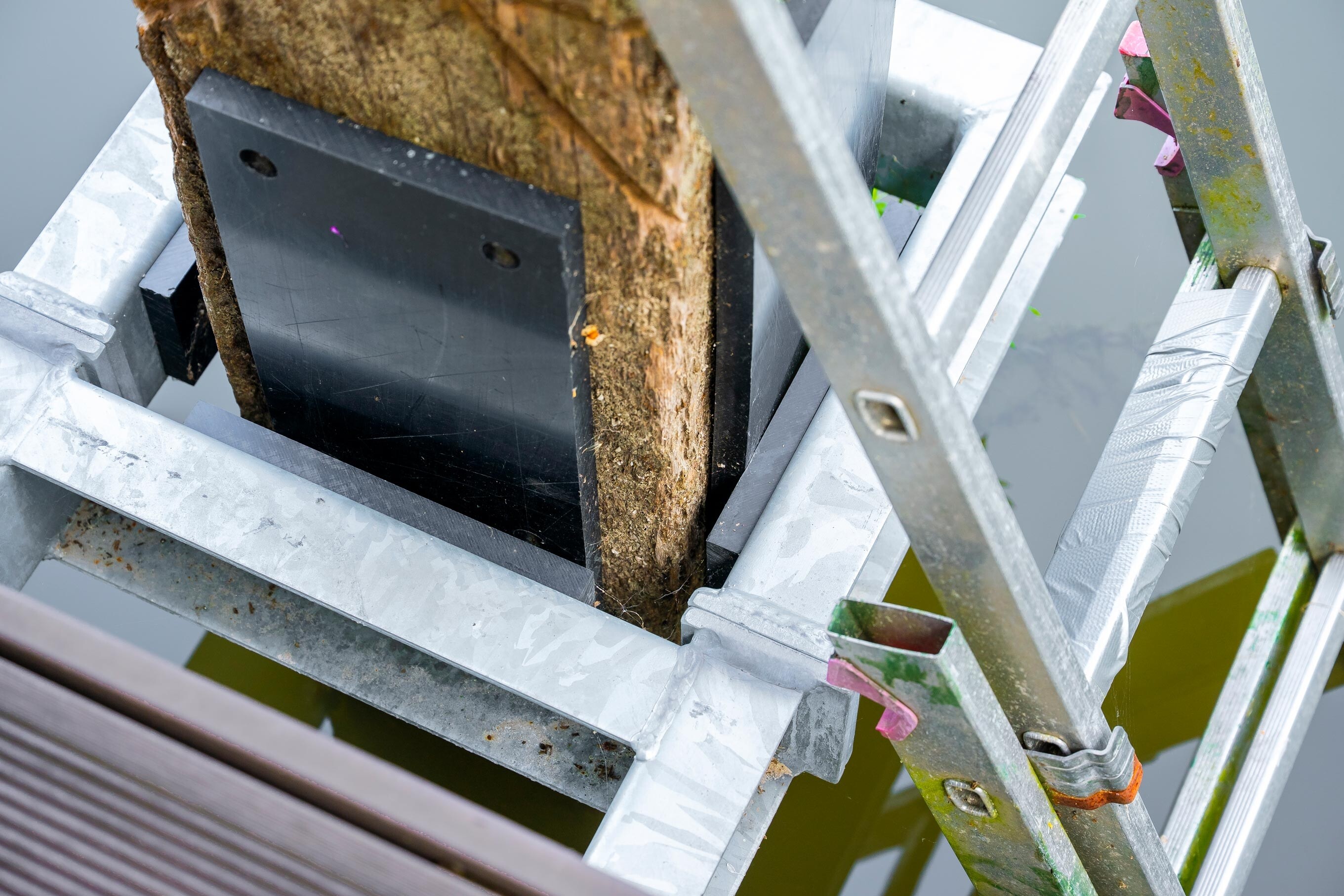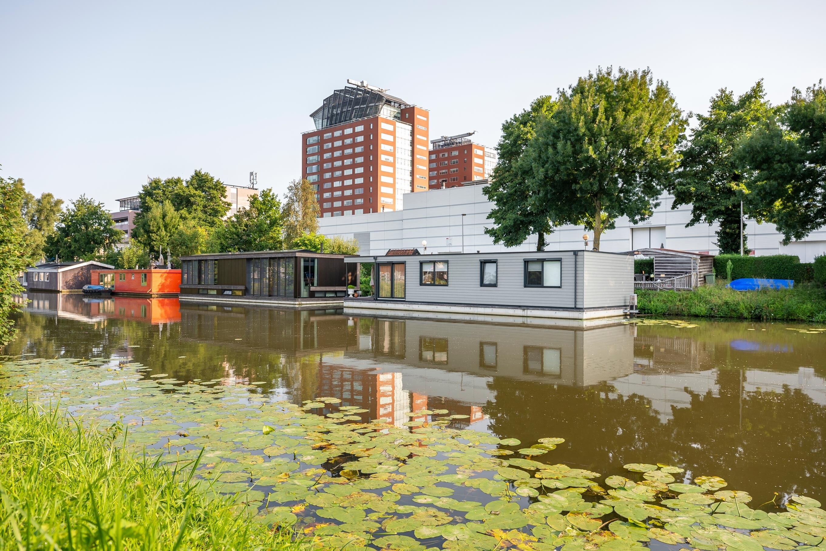 Voor drie nieuwe woonarken in Utrecht hebben we zware meerpalen van 30x30 cm en 10 meter lang geplaatst, inclusief een speciaal geleidesysteem. Dit laat de arken geleidelijk meebewegen met het wisselende waterpeil, zodat je daar binnen nauwelijks iets van merkt. De werkzaamheden zijn volledig vanaf het water uitgevoerd.