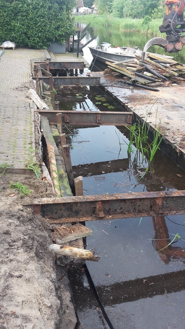 Er was al straatwerk en een damwand aanwezig in de tuin. Dat betekende voor ons dat alles afgebroken en afgevoerd moest worden. De uitdaging hierbij was dat alles via het water moest gebeuren. Via onze pontons was het gelukkig snel te realiseren.