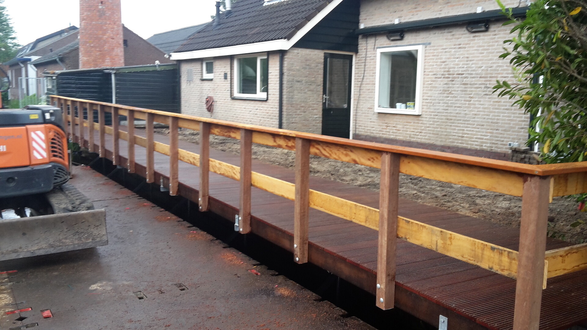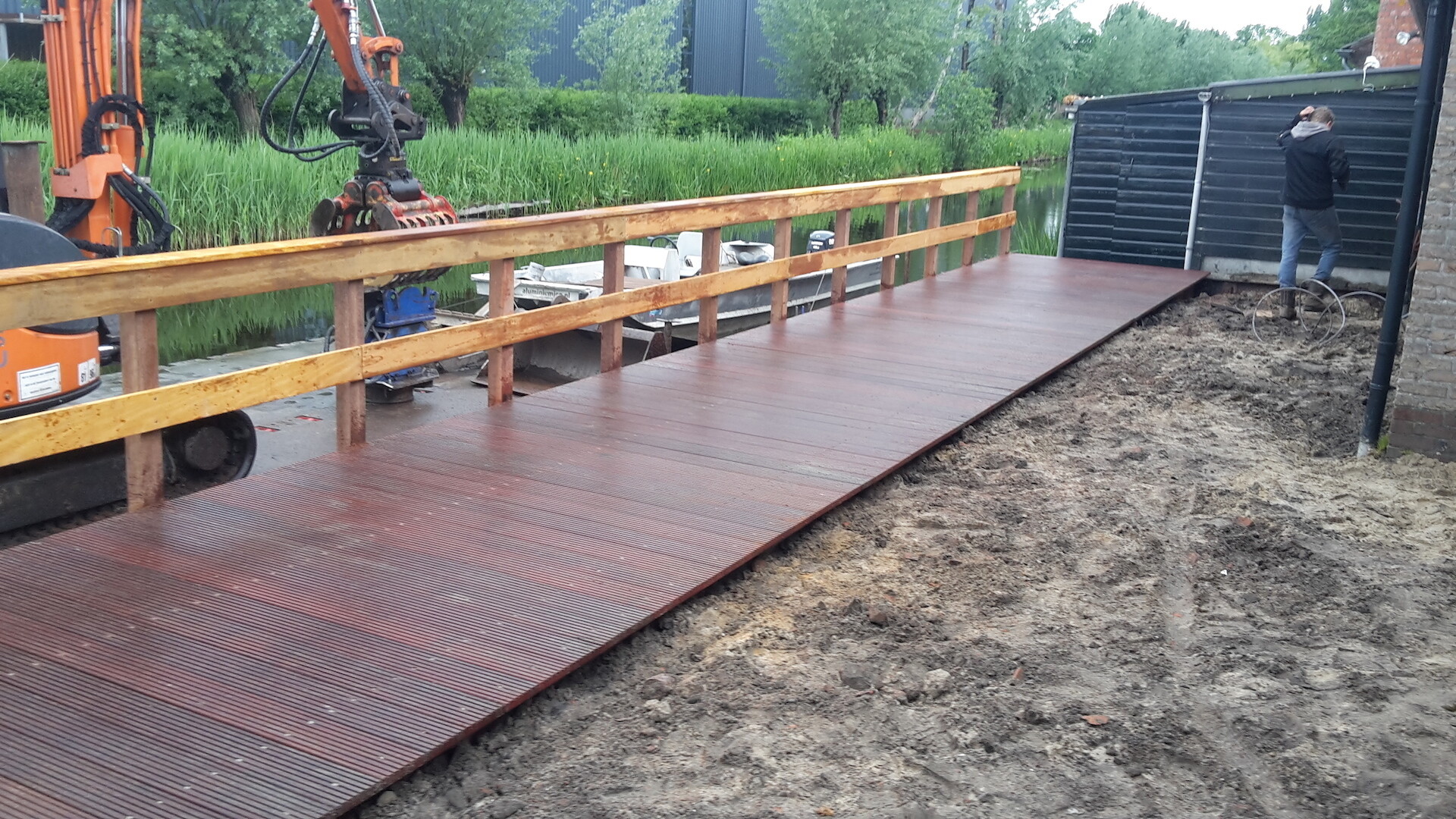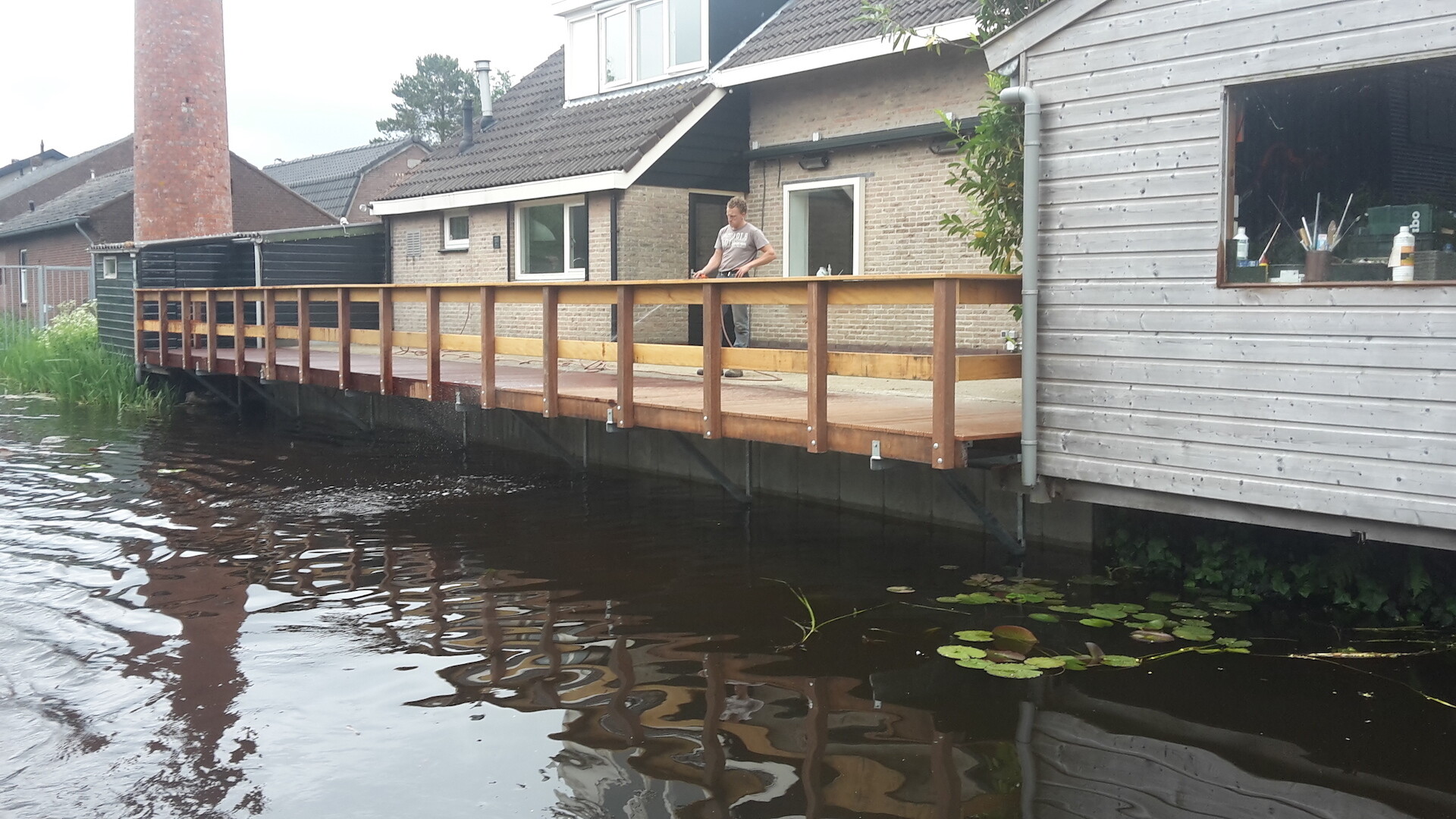Nadat de betonnen damwand is geplaatst, heben we de hardhouten vlonder eraan gemonteerd. Het beton biedt hier voldoende ondersteuning voor, dus dat was goed te realiseren. Door deze vlonder is de tuin meer dan 2 meter breder geworden.