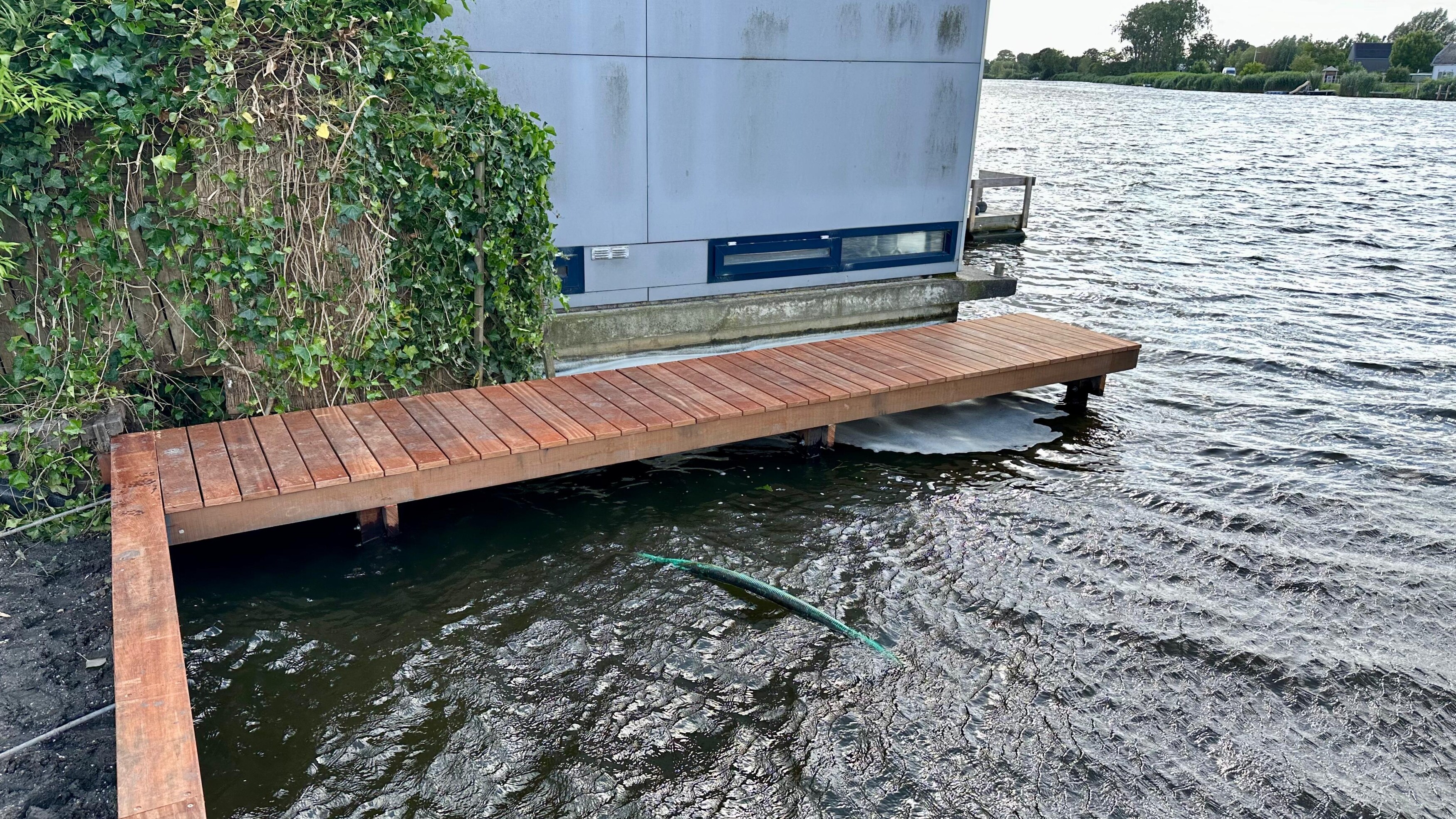 Naast het werk aan de waterkant zorgden we ook voor een nieuwe fundering voor de schuur. Daarop brachten we een hardhouten vloer aan, die aansluit bij het materiaalgebruik van de rest van het project.