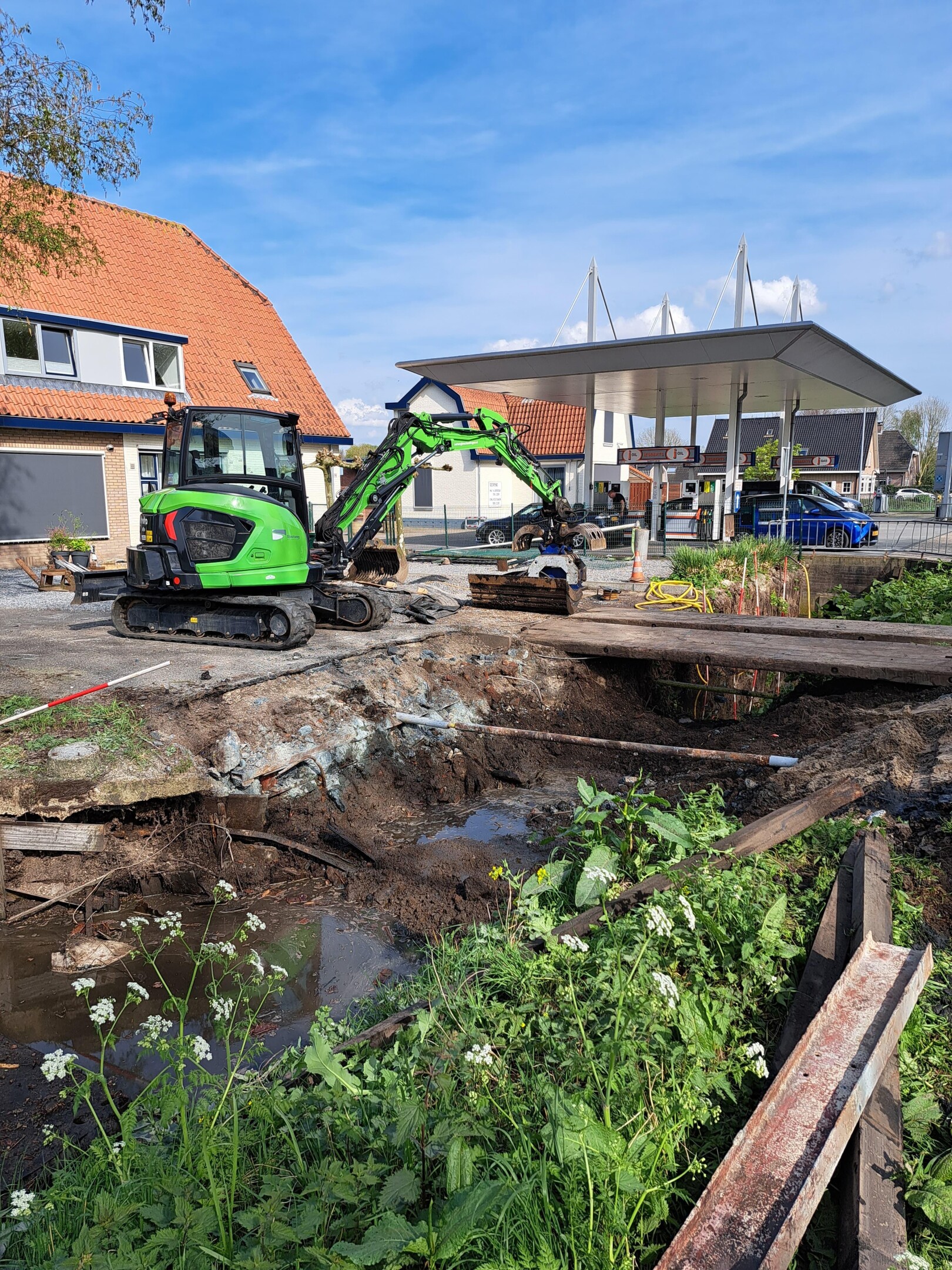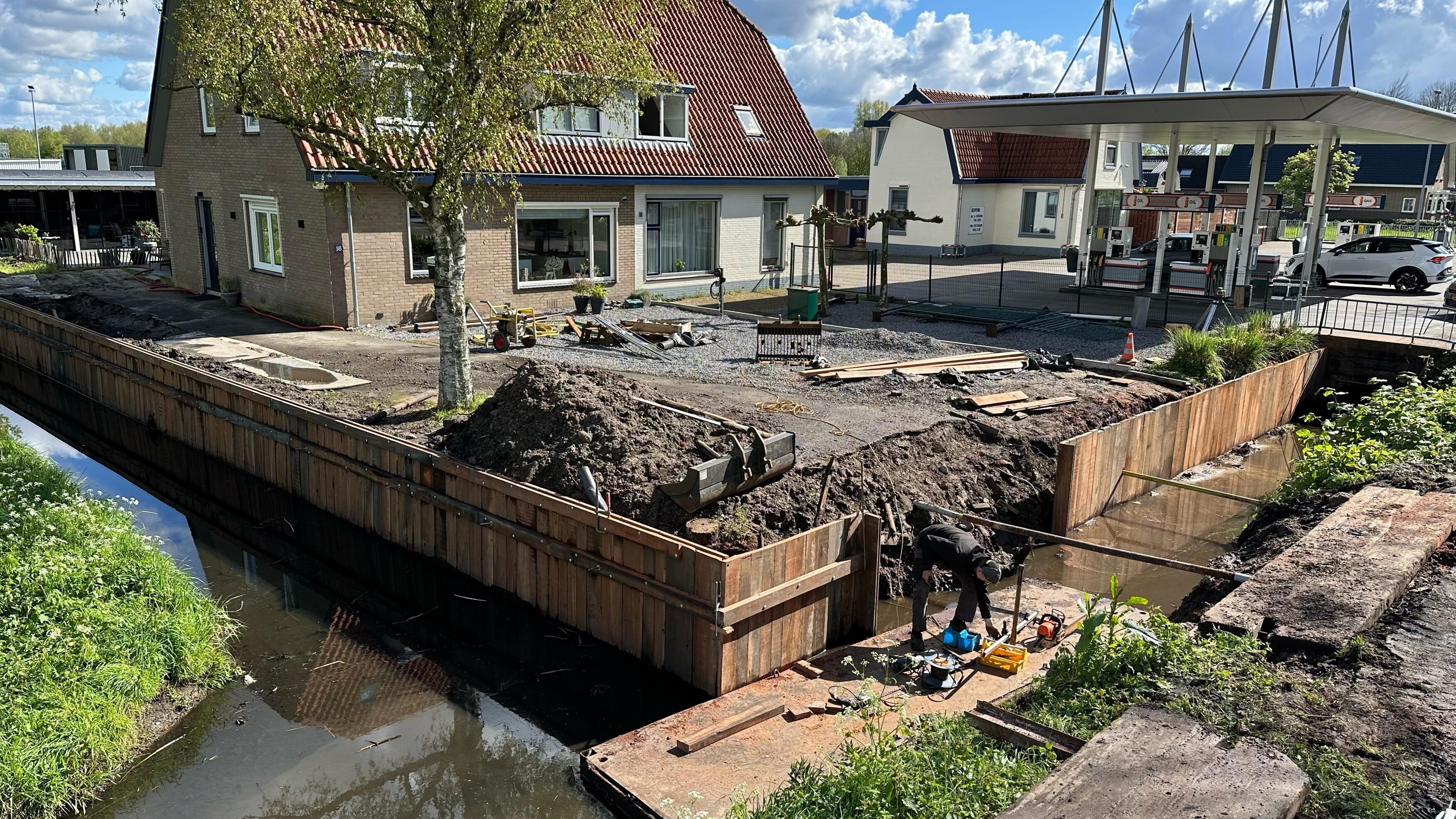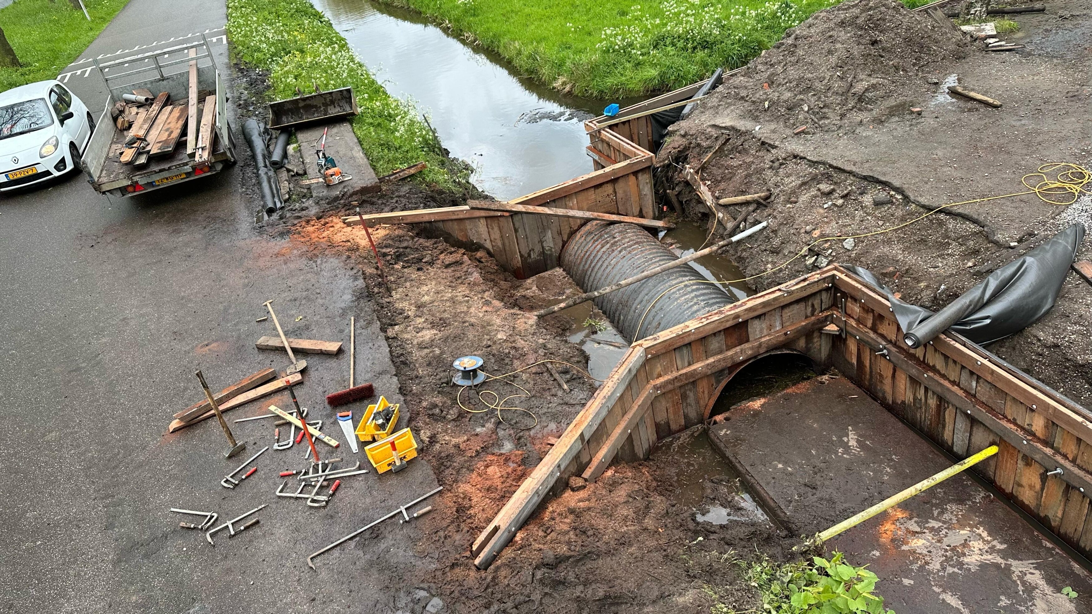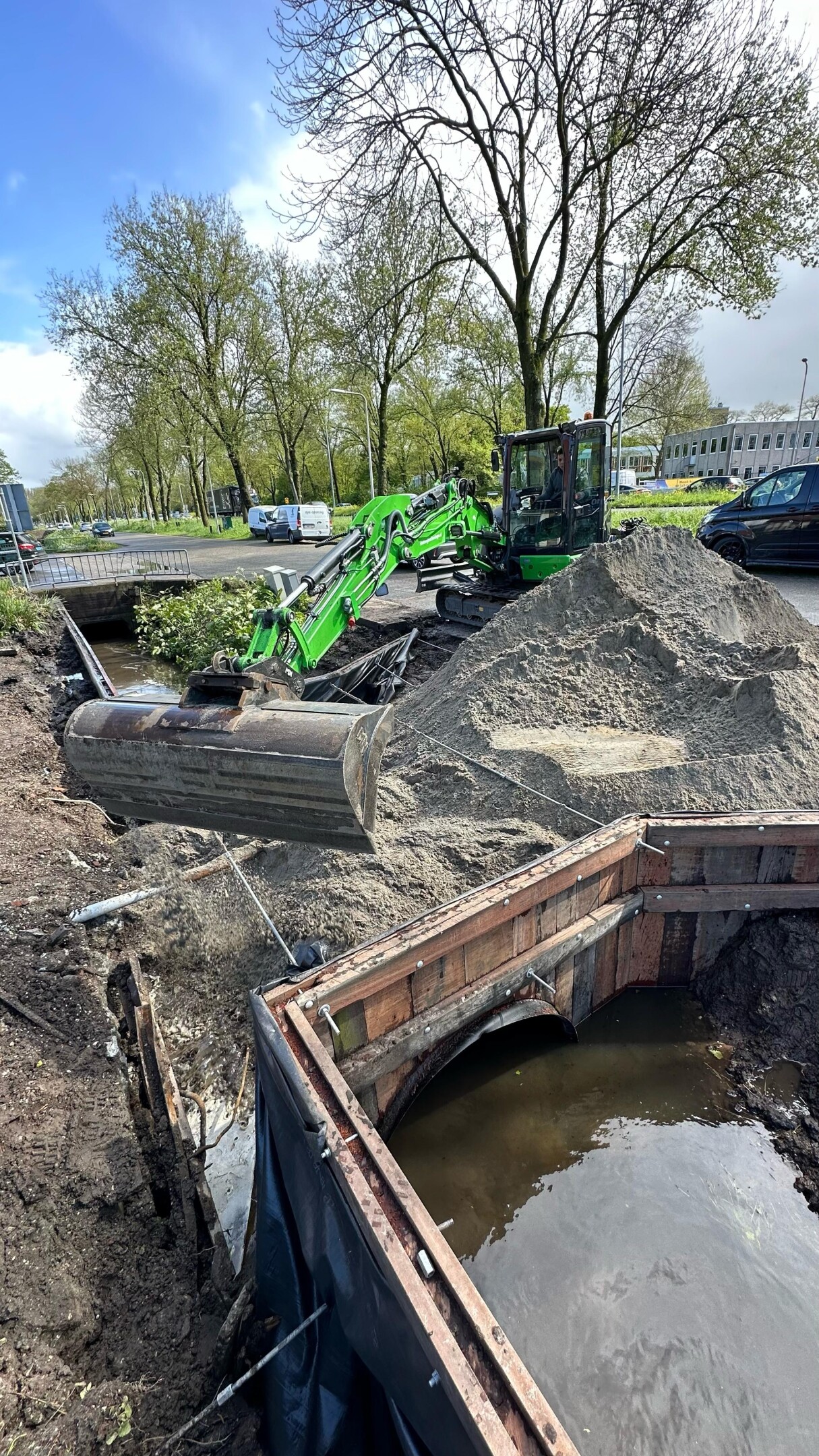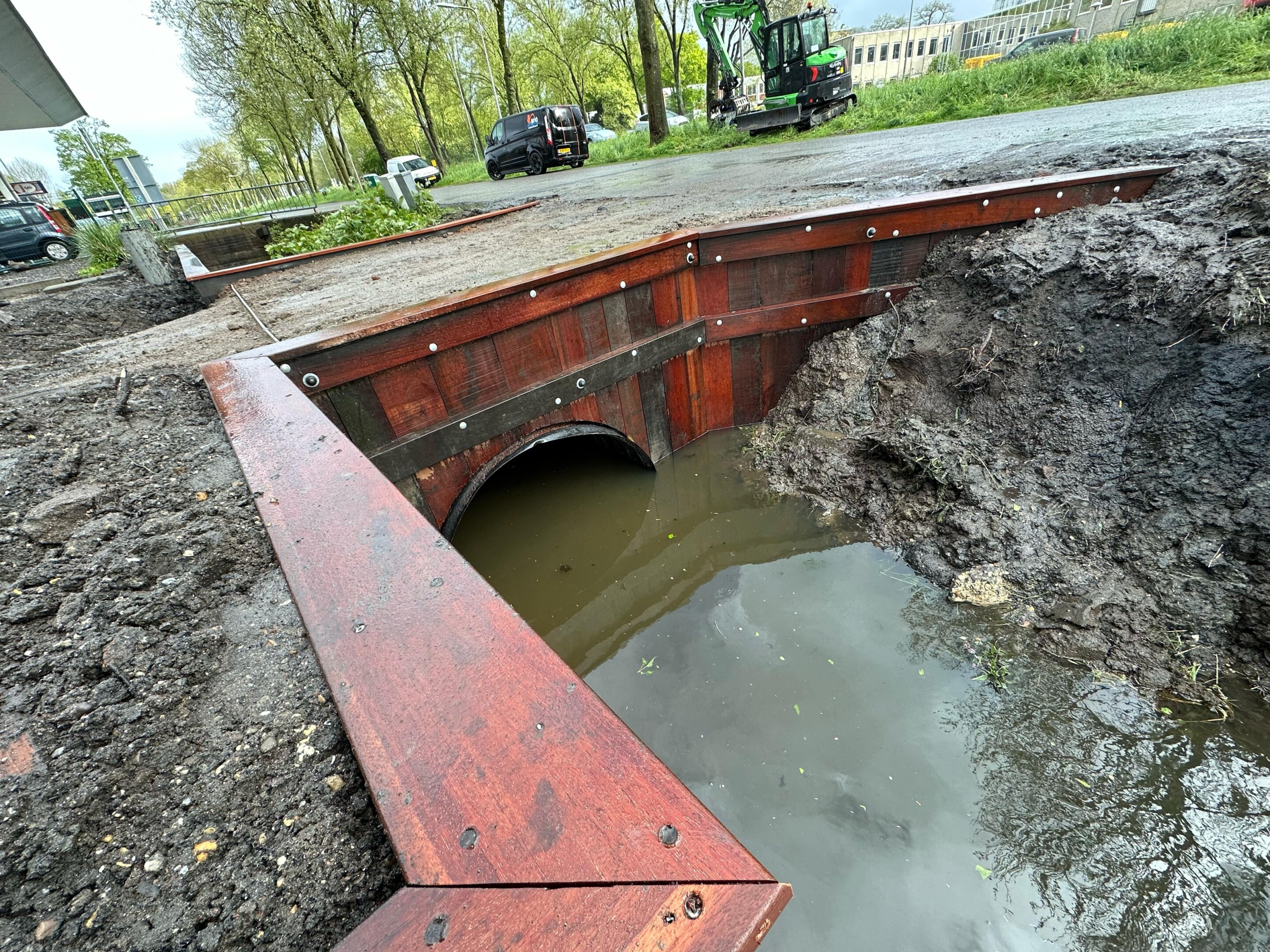 In Utrecht vervingen we een oude damwand én een verouderde brug. De betonnen brug was in slechte staat en niet meer geschikt voor veilig gebruik. Daarom is deze volledig gesloopt, waarna we een nieuwe dam hebben aangelegd, voorzien van een duikerbuis en stevige hardhouten damwanden.