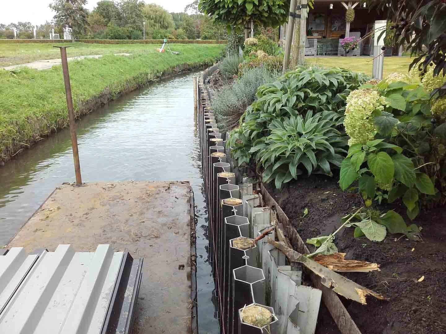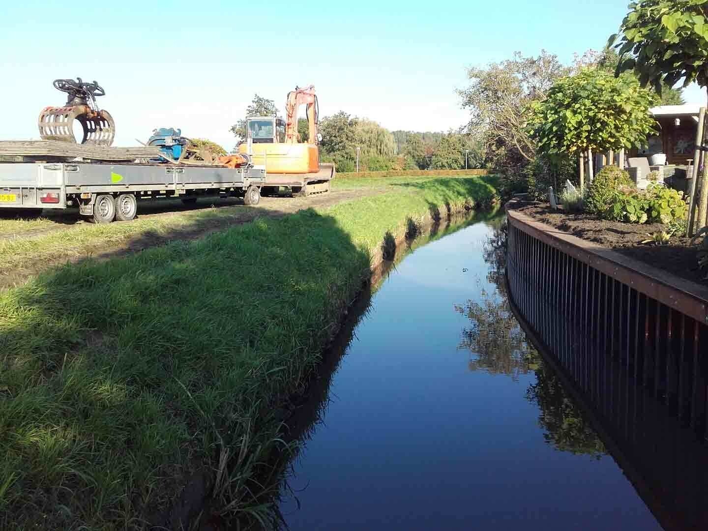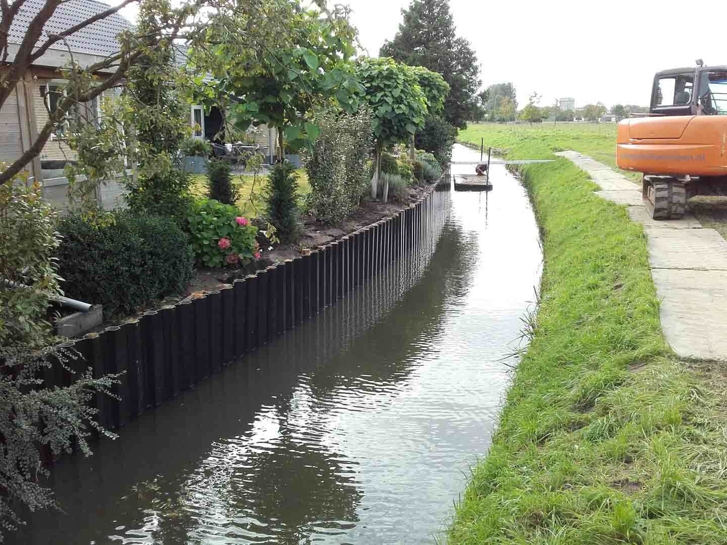 Voor ons was het prettig werken in Fijnaart, omdat we vanaf de overkant met onze kraan bij de waterkant konden komen. Nadat de kunststof beschoeiing was geplaatst, hebben we het geheel afgewerkt meteen hardhouten gording en afdekplank.