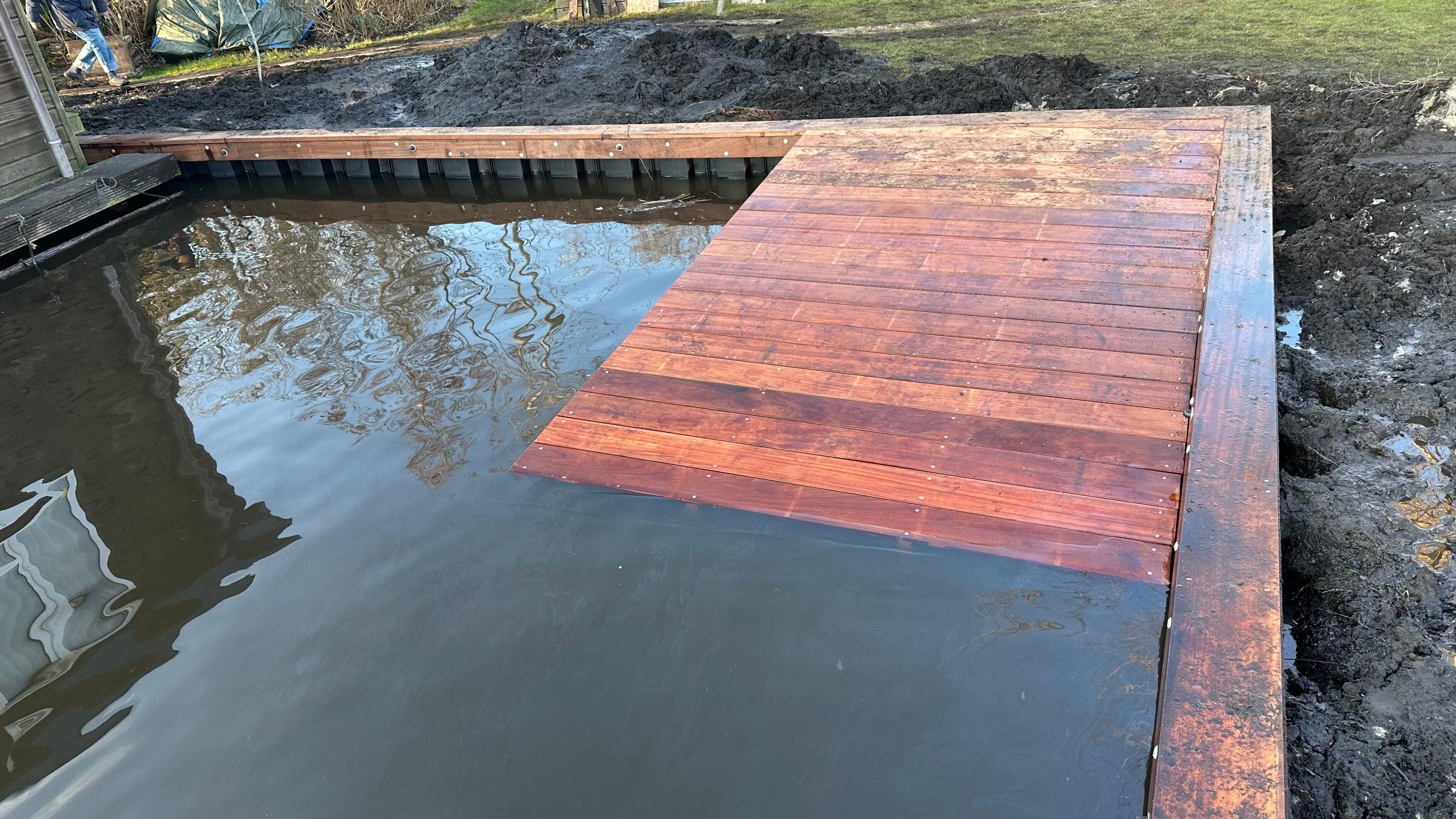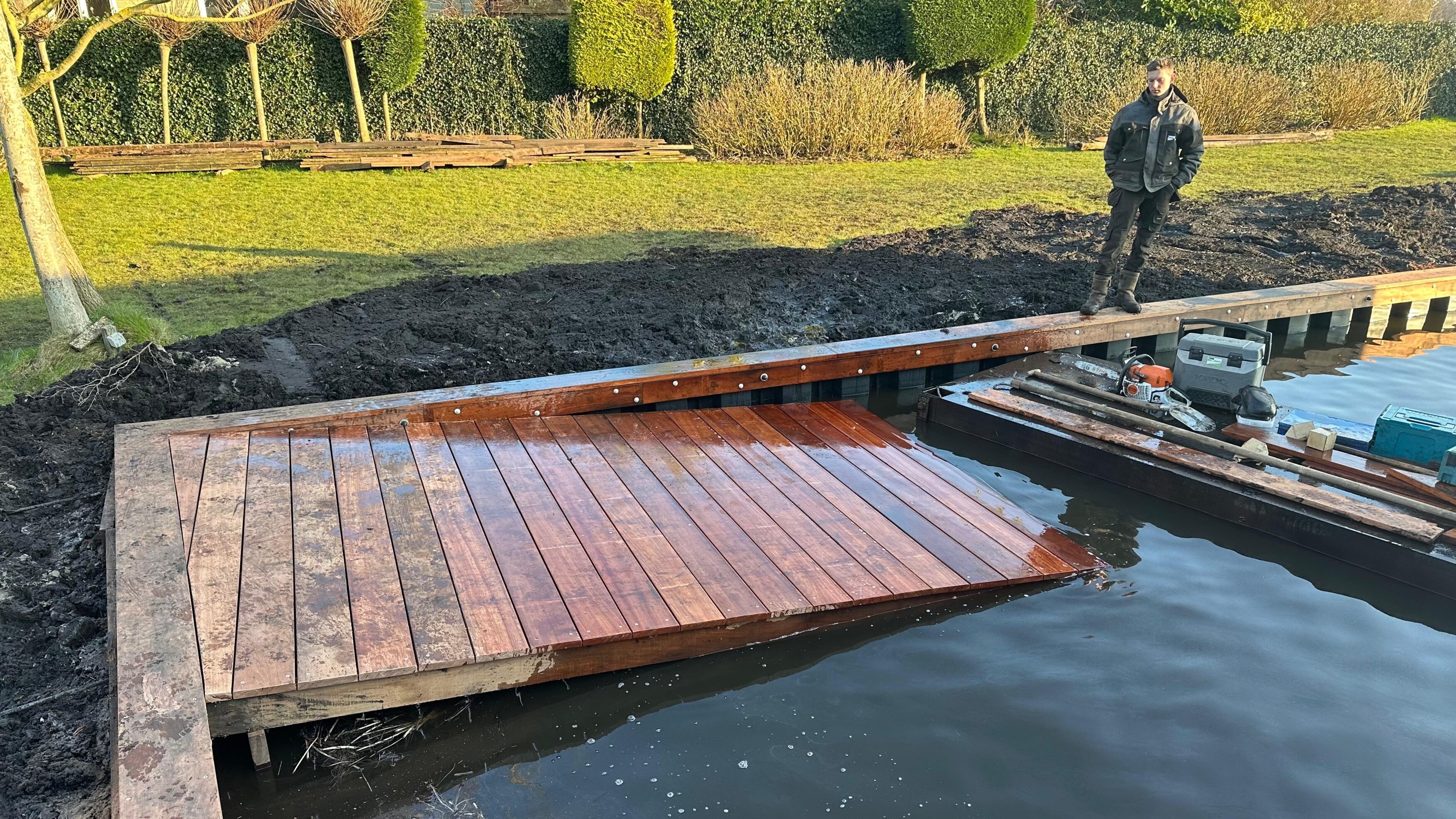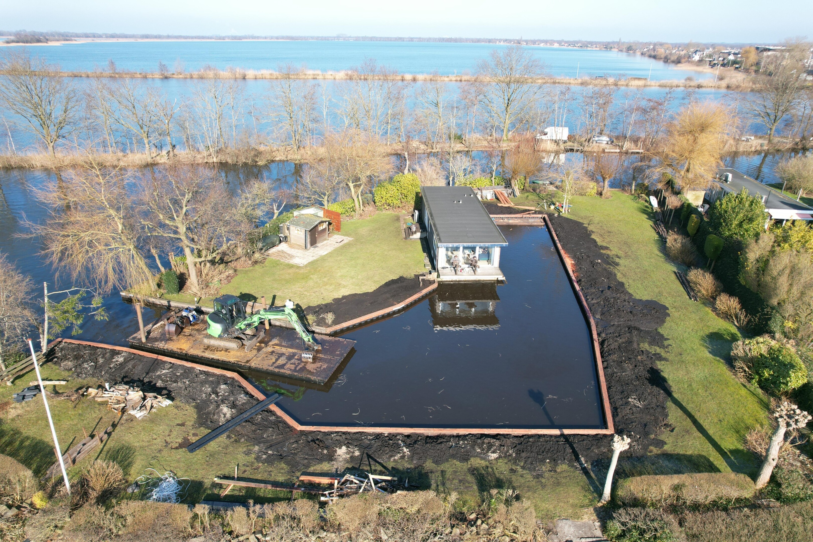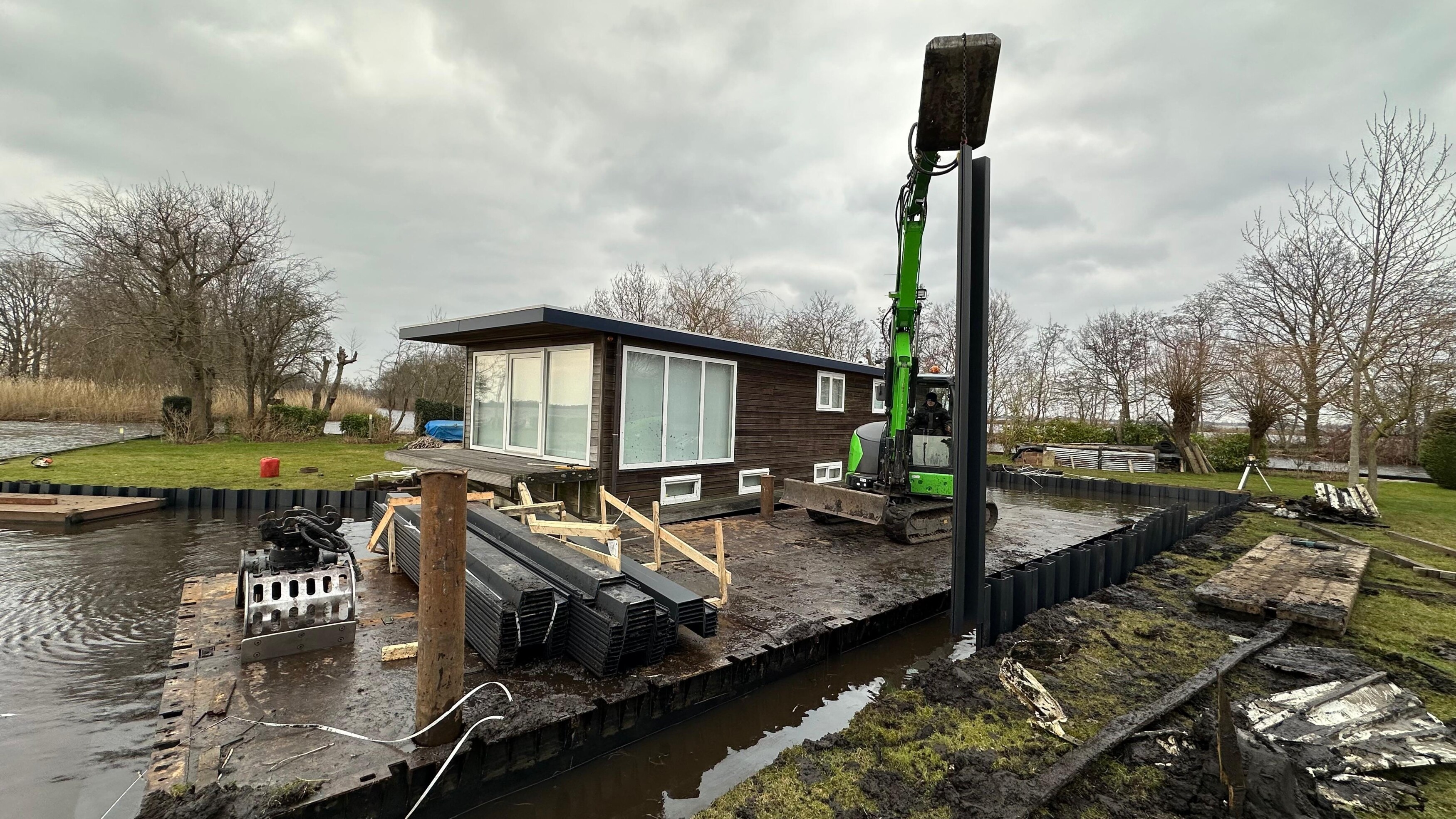 In een beschutte kom van een eiland in Loosdrecht plaatsten we nieuwe kunststof damwanden. Door de beperkte doorvaart en krappe ruimte werkten we met een kleinere kraan en een compact ponton – zodat we toch veilig en nauwkeurig konden manoeuvreren.