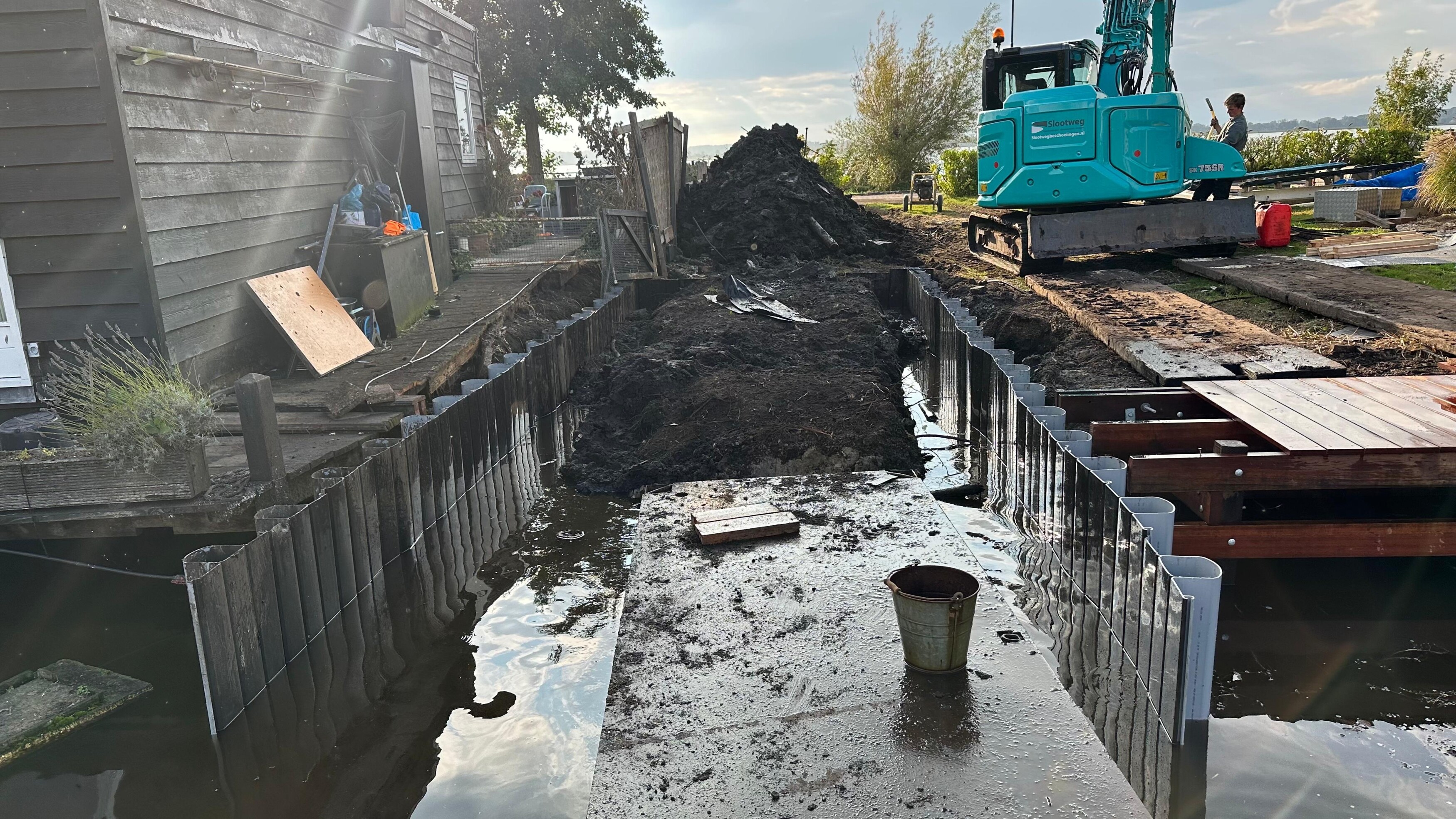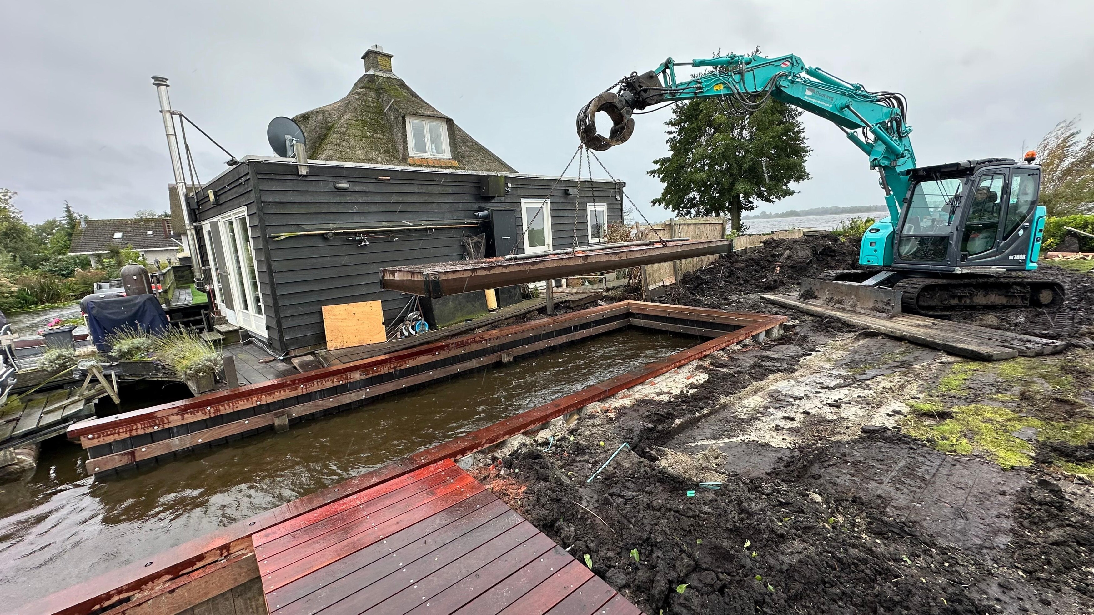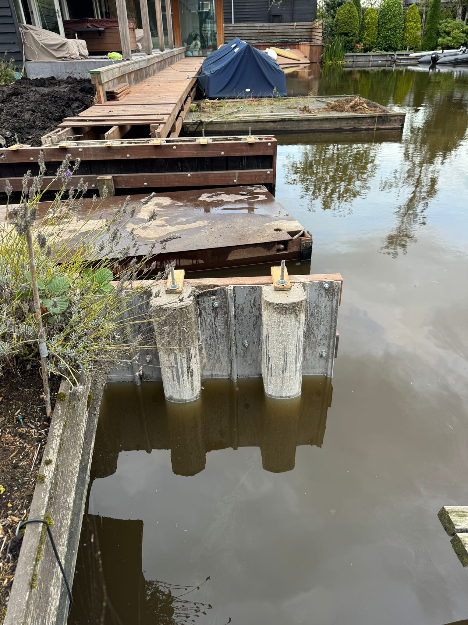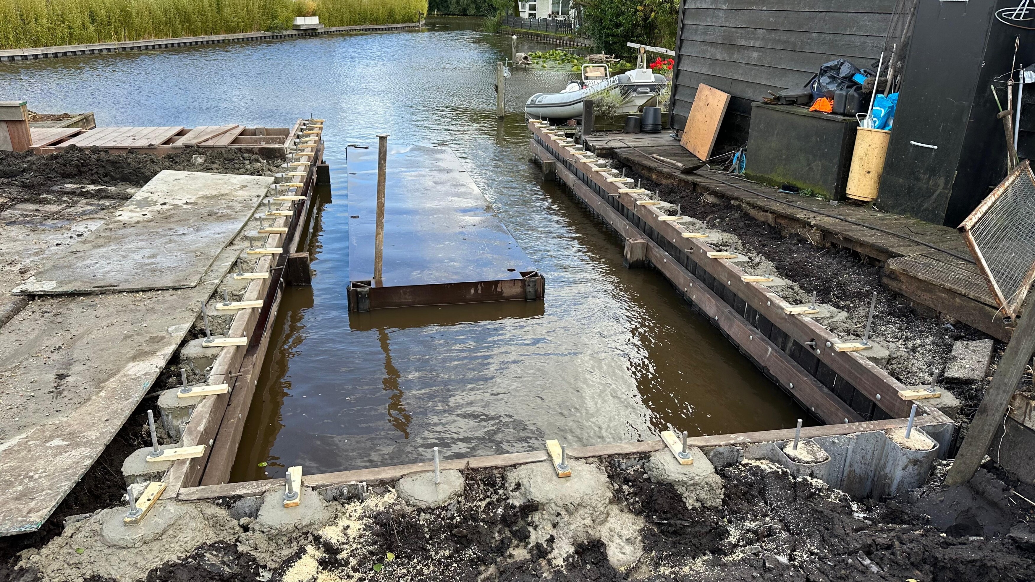 Voor de fundering van een nieuw te bouwen boothuis plaatsten we een kunststof damwand die tegelijk dienstdoet als keerwand en funderingsbasis. Alle palen zijn onder water getrild en vervolgens volgestort met beton. Daarmee ontstond een solide basis die bestand is tegen waterdruk én geschikt is voor verdere opbouw.