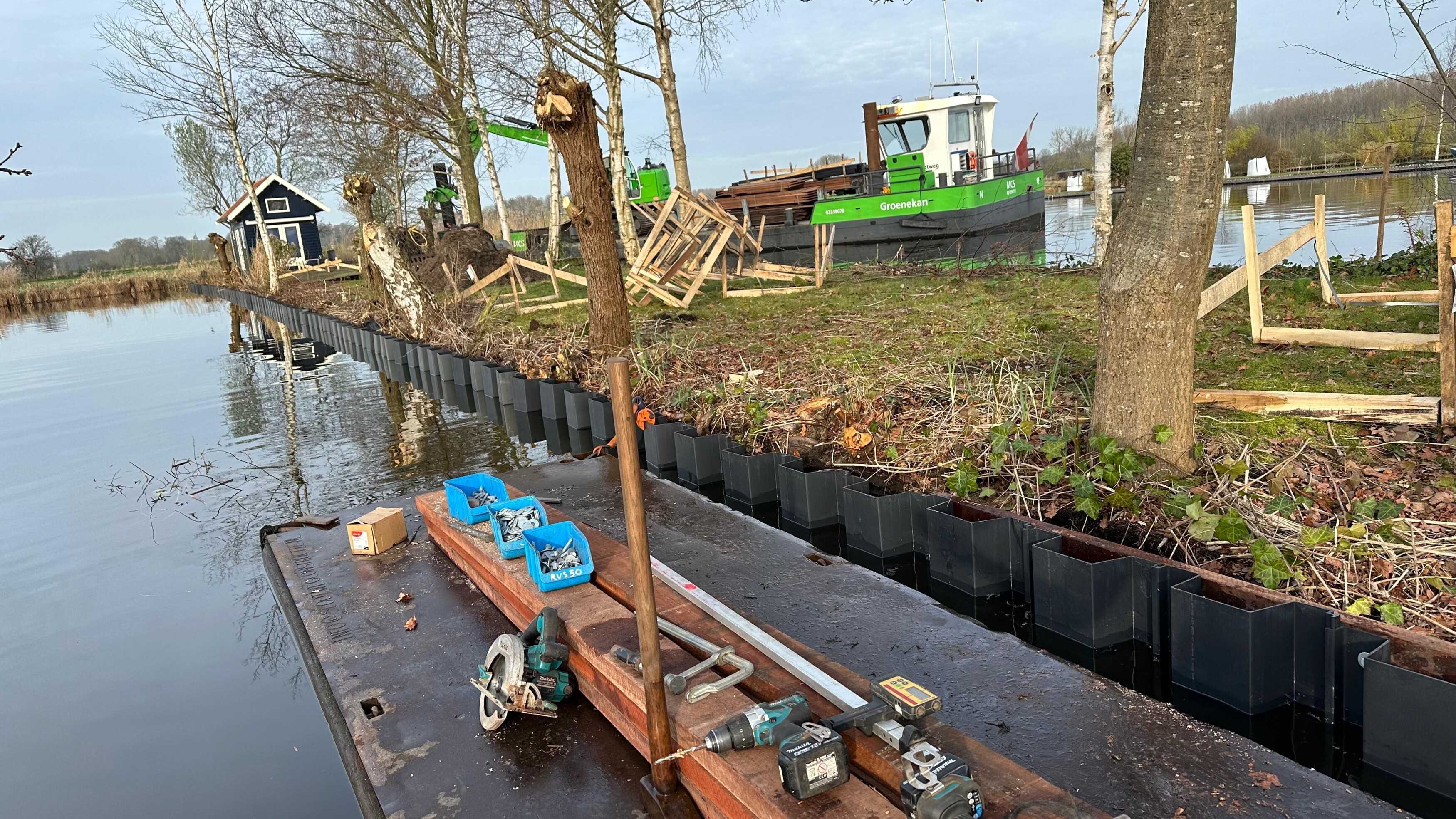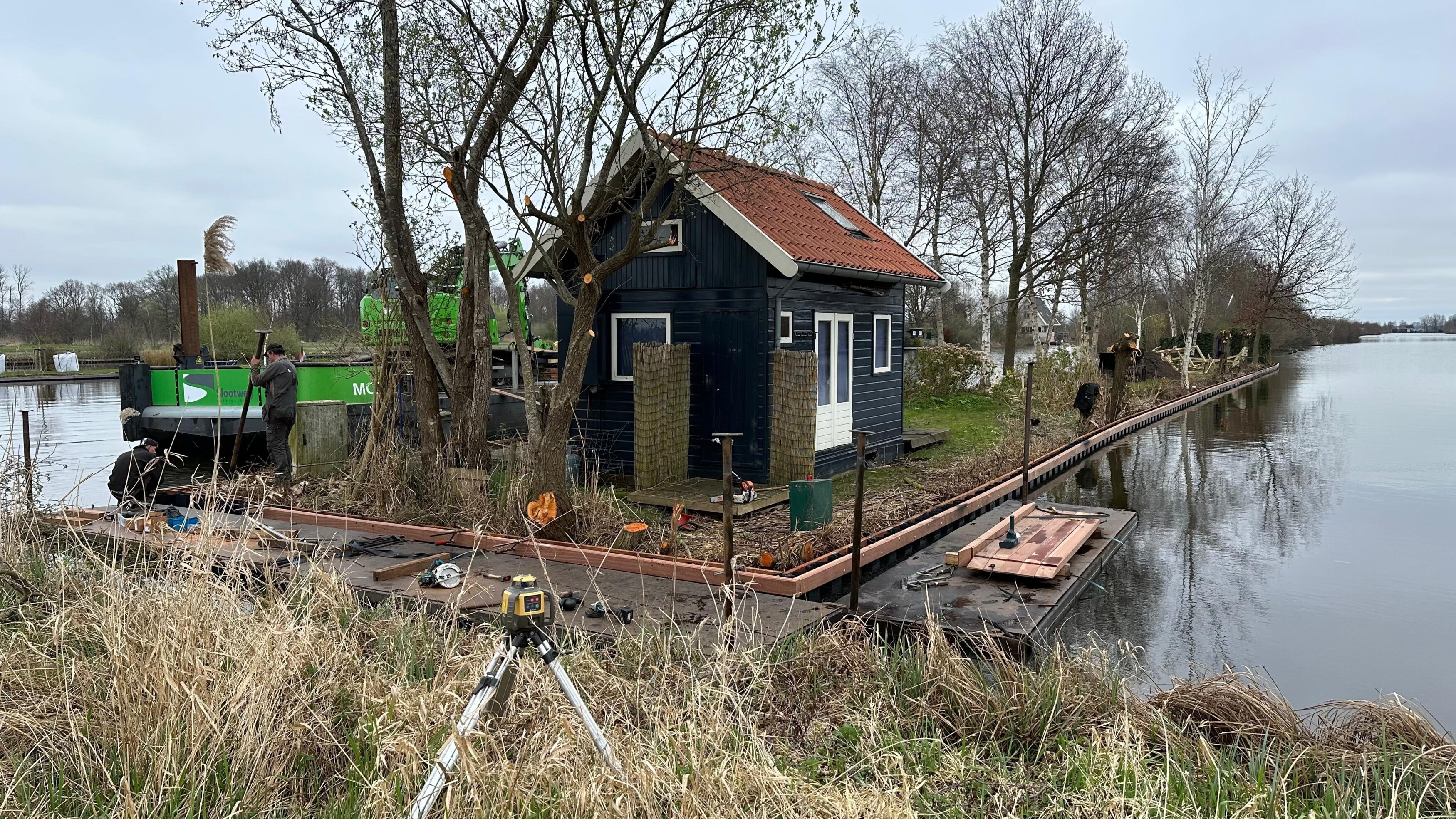 Op een eiland in de Zuidelijke Kievitsbuurt van de Loosdrechtse Plassen vervingen we de volledige beschoeiing door een nieuwe kunststof damwand. Rond het hele eiland hebben we deze afgewerkt met een hardhouten deklijst, voor een natuurlijke uitstraling en extra stevigheid.