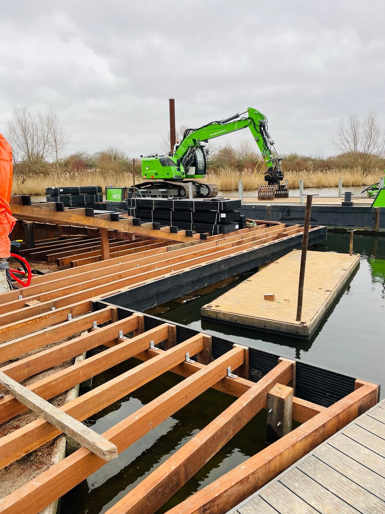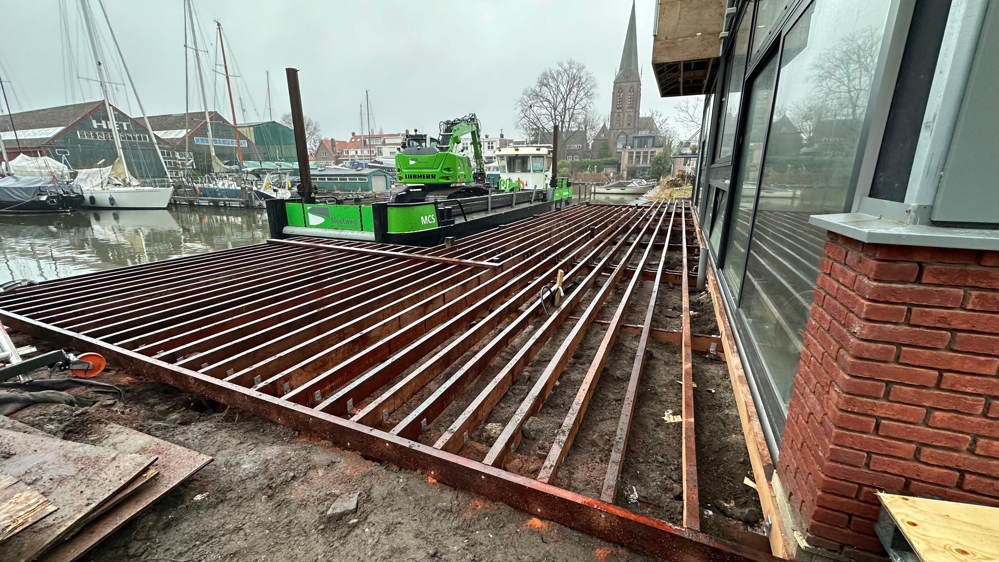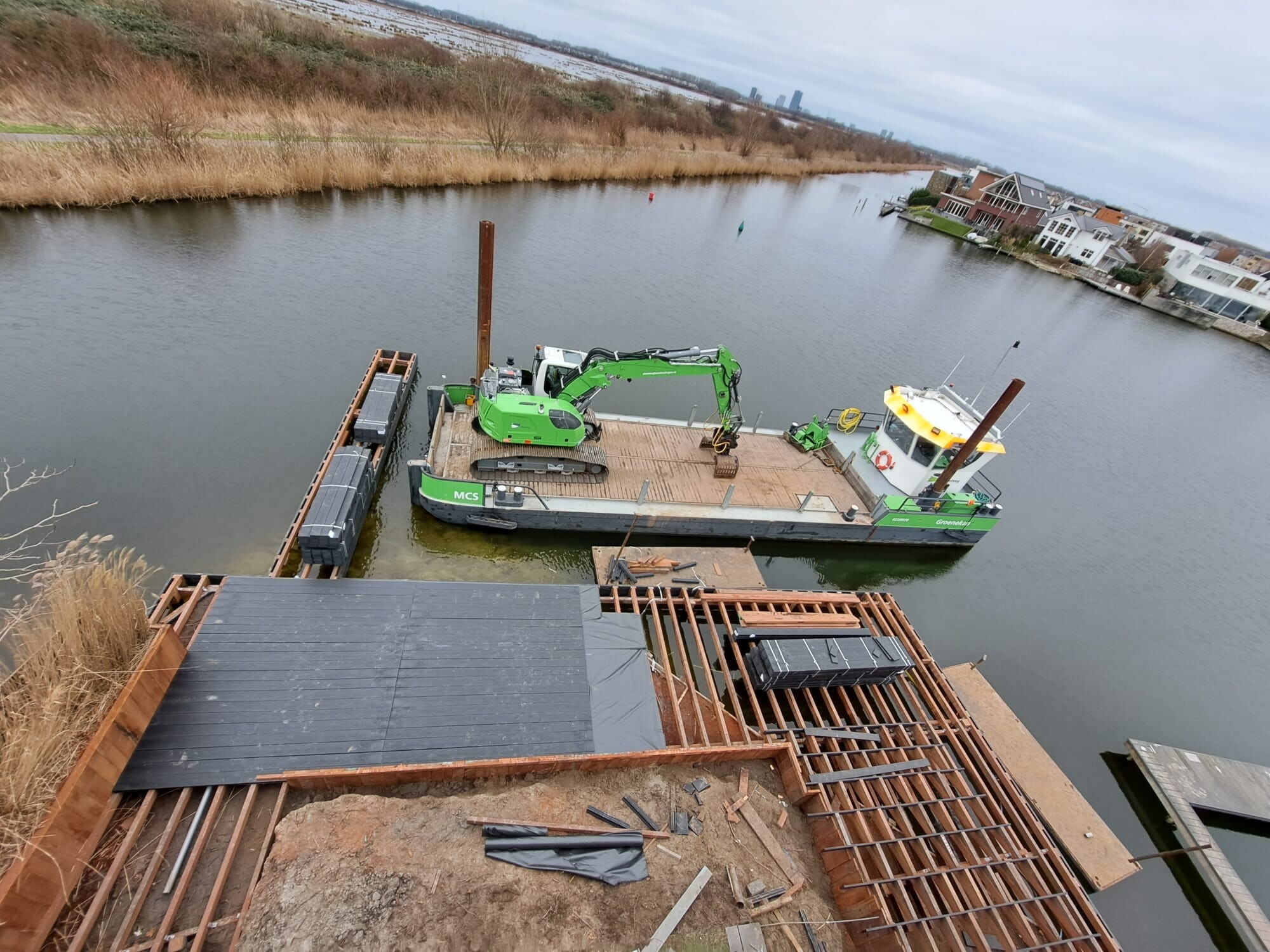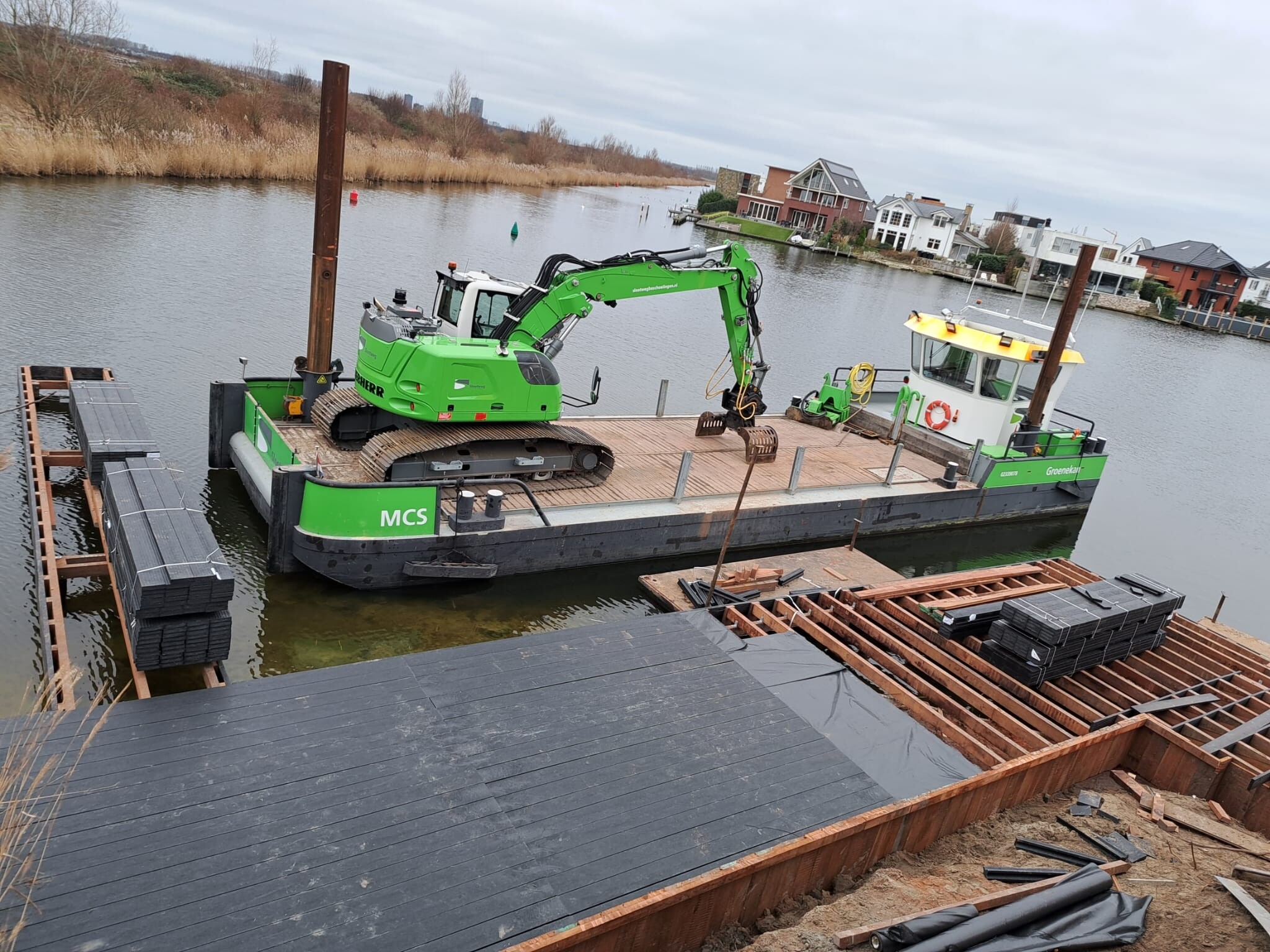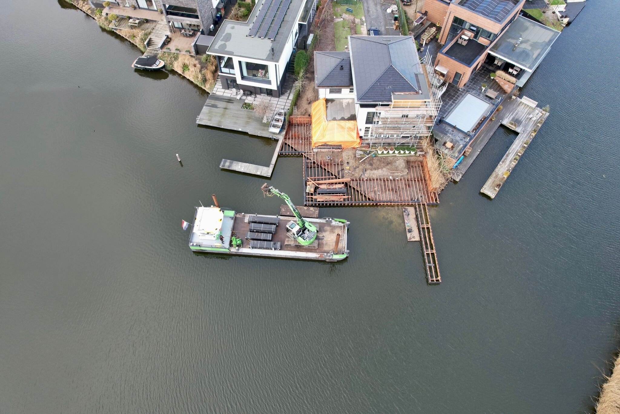 Vooraf zijn alle oude steigers verwijderd en afgevoerd. Daarnaast hebben we ruim 150 m³ grond afgevoerd – volledig via het water, om de tuin en omgeving te ontzien.