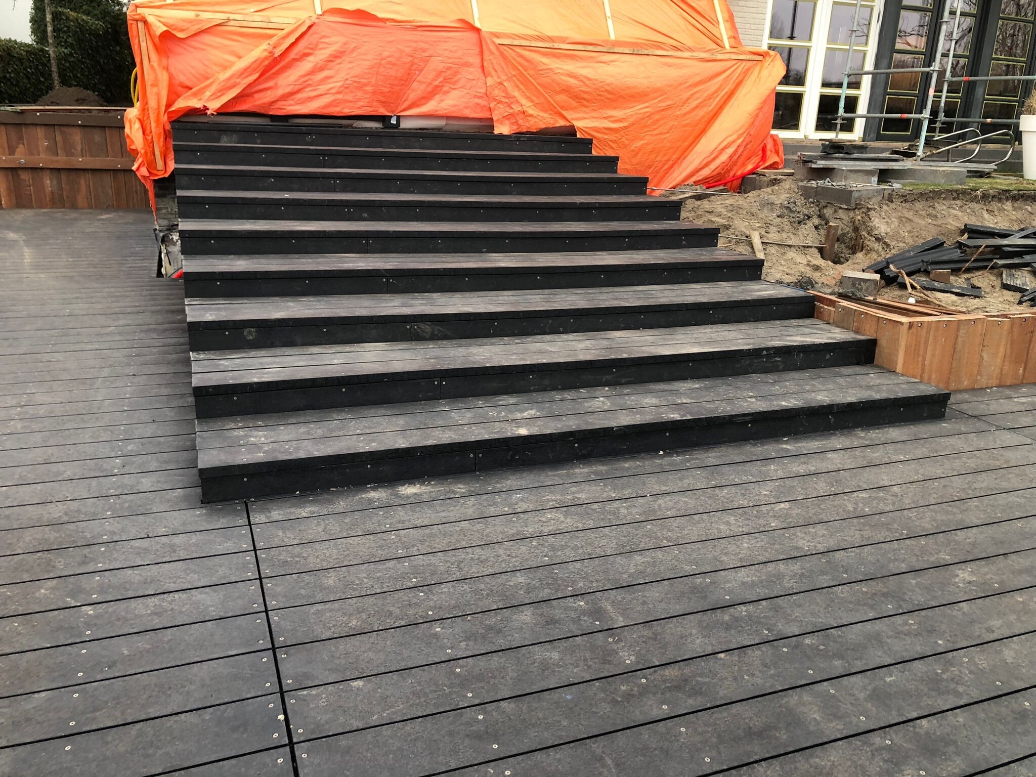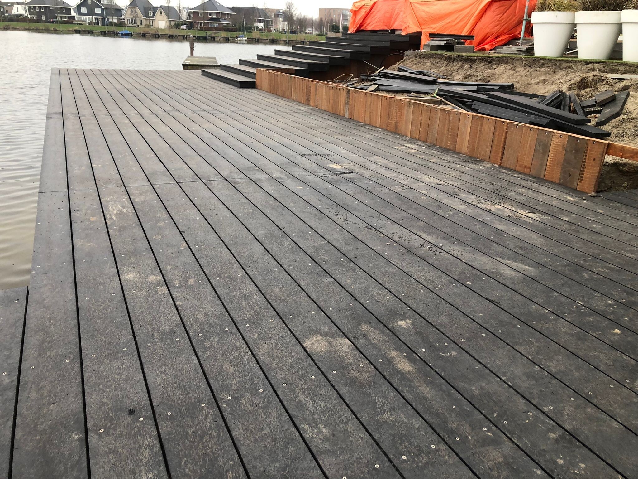 Aan de Noorderplassen in Almere vervingen we de bestaande hardhouten steigers door een nieuwe constructie met een kunststof dek en een stevige hardhouten onderbouw. De nieuwe steiger is voorzien van een groot, verlaagd gedeelte aan het water én een brede trap die comfortabel doorloopt naar de woning.