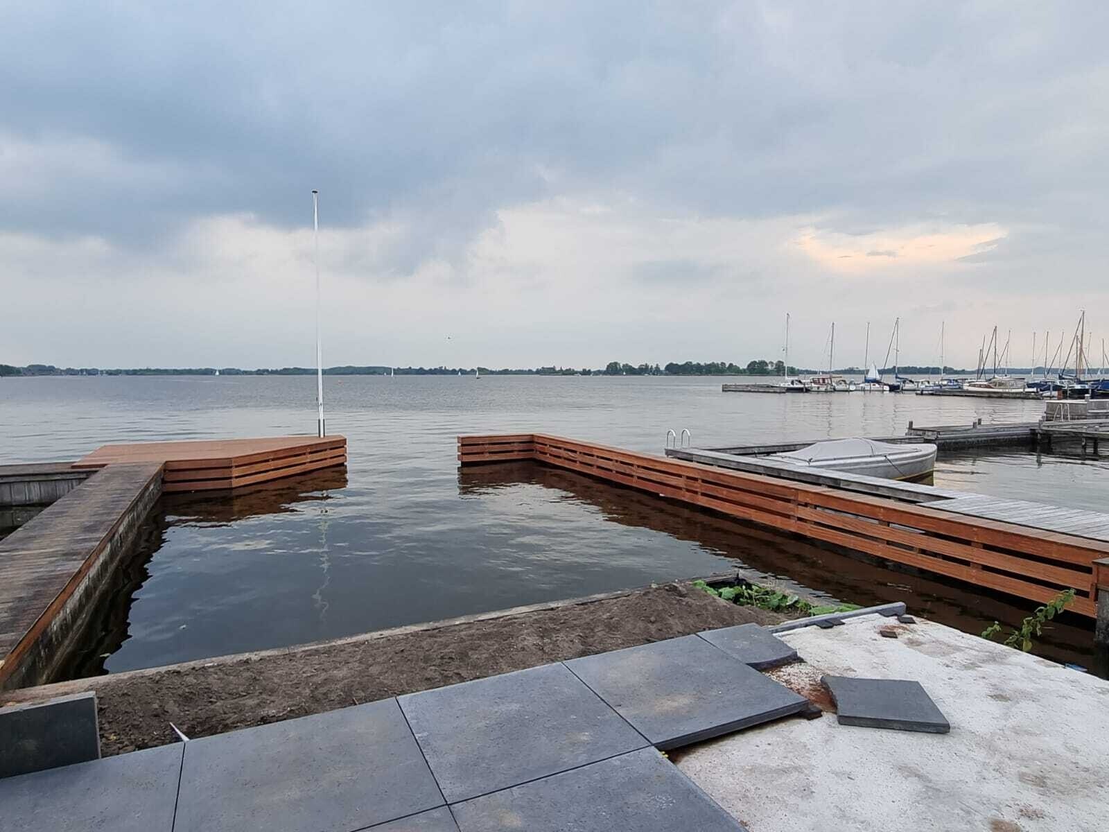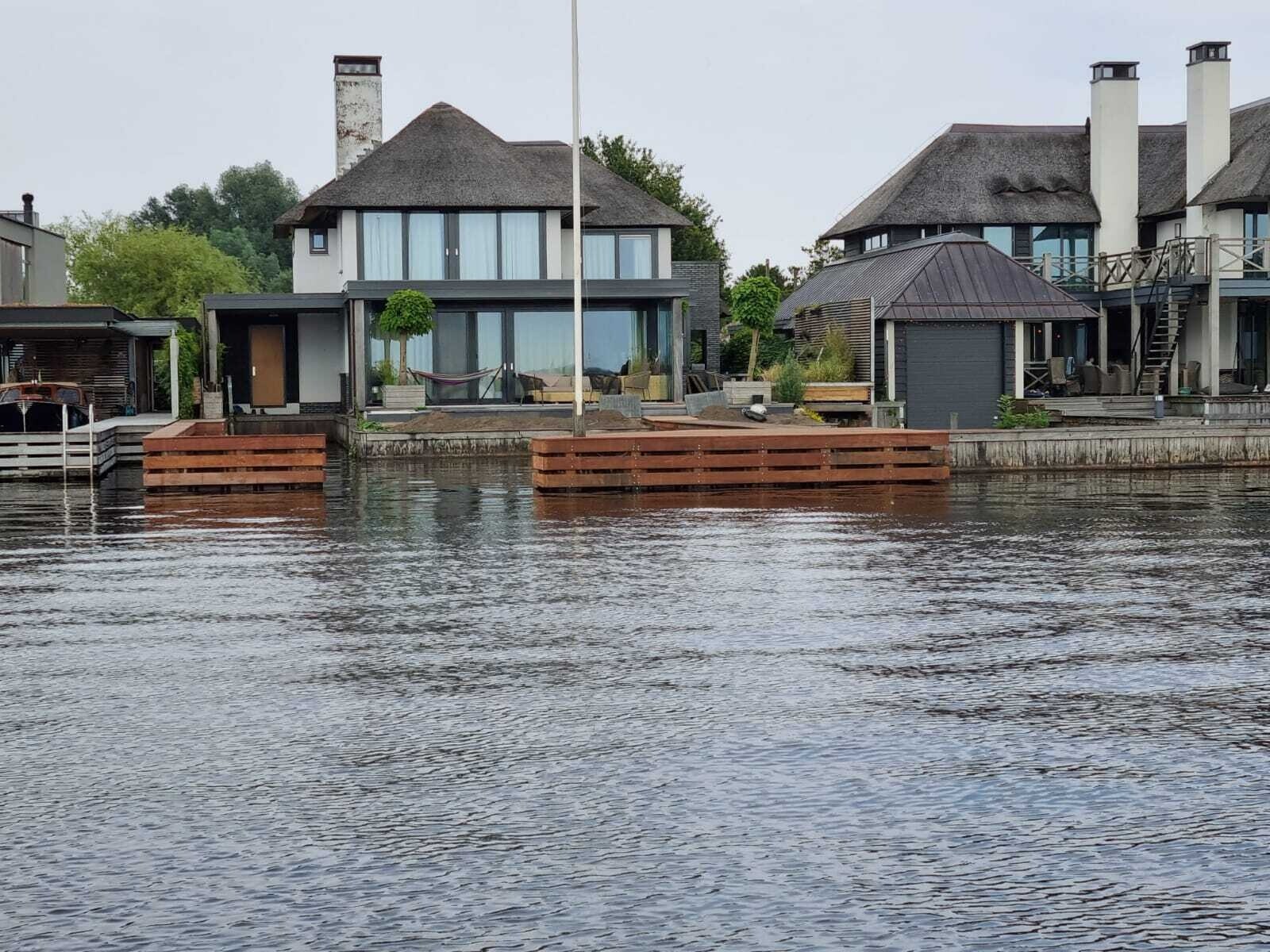 Deze klant in Loosdrecht had erg last van golven, waardoor hij geen boot achter zijn huis kon leggen. Om dit op te lossen hebben wij stalen damwanden aangebracht en deze bekleed met hardhouten gordingen met daarop een loopsteiger en terras. Alle werkzaamheden zijn verricht vanaf het water met ons werkschip. Het resultaat zijn te zien in de foto's.