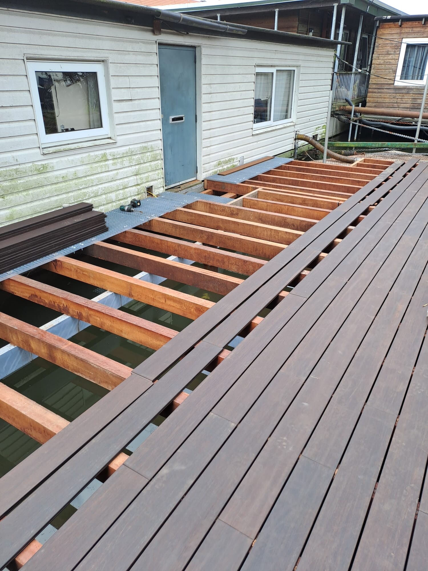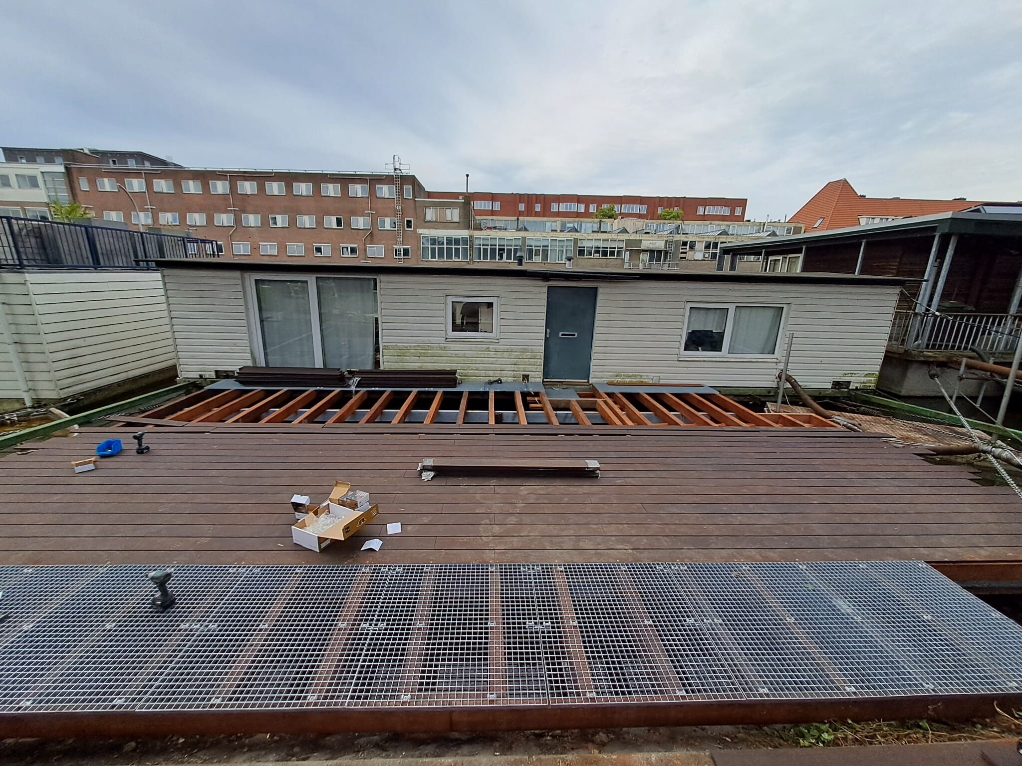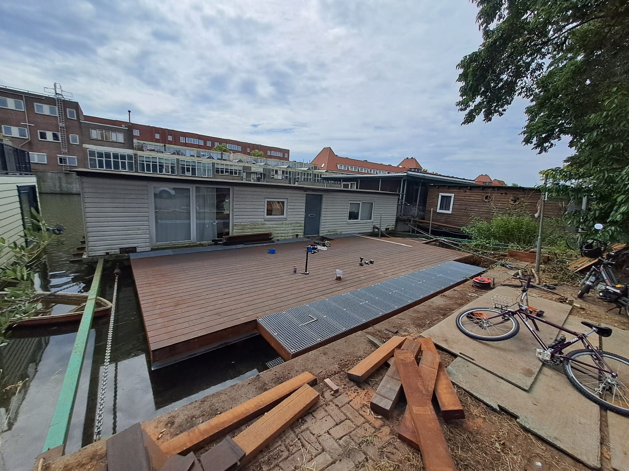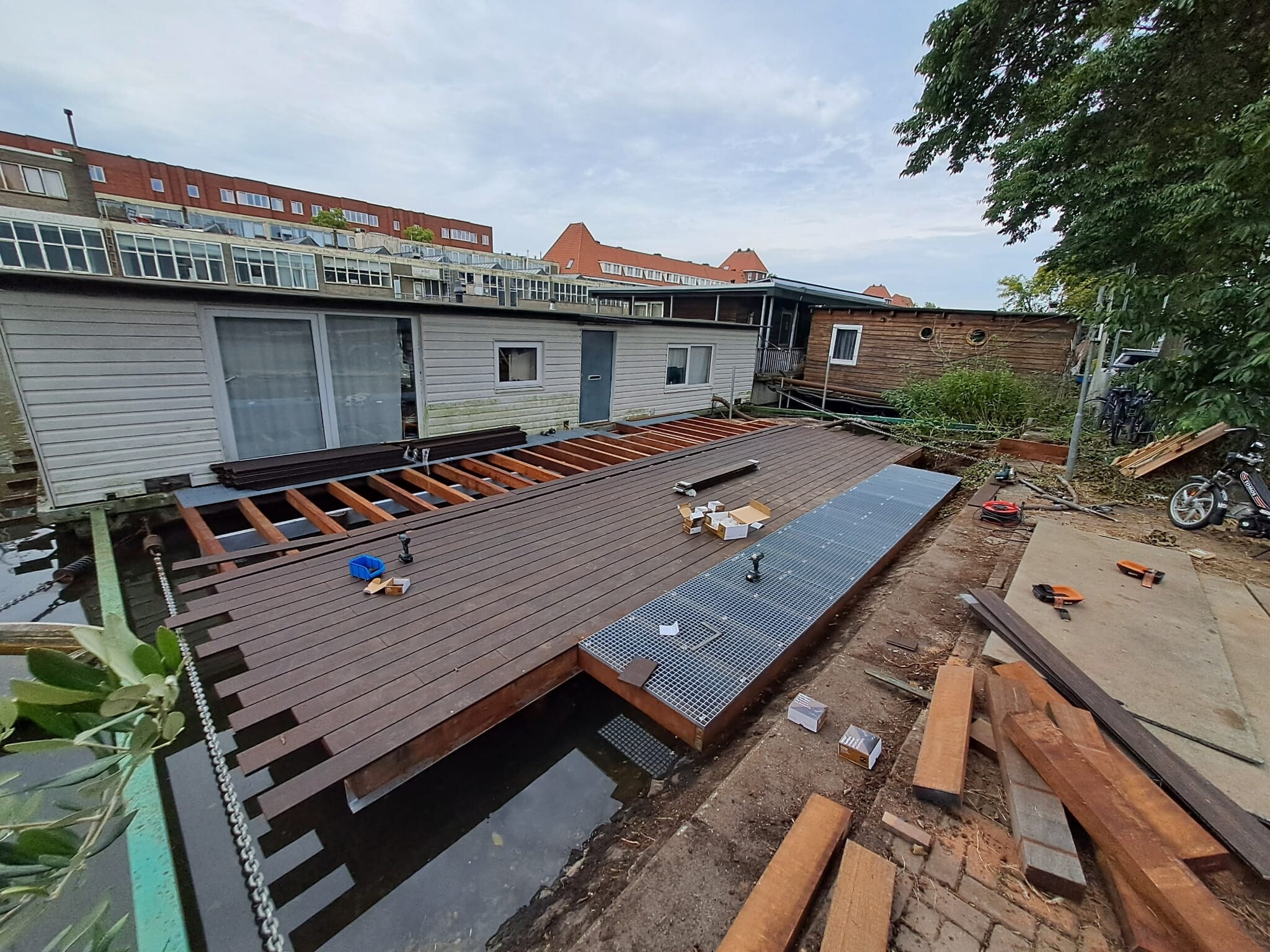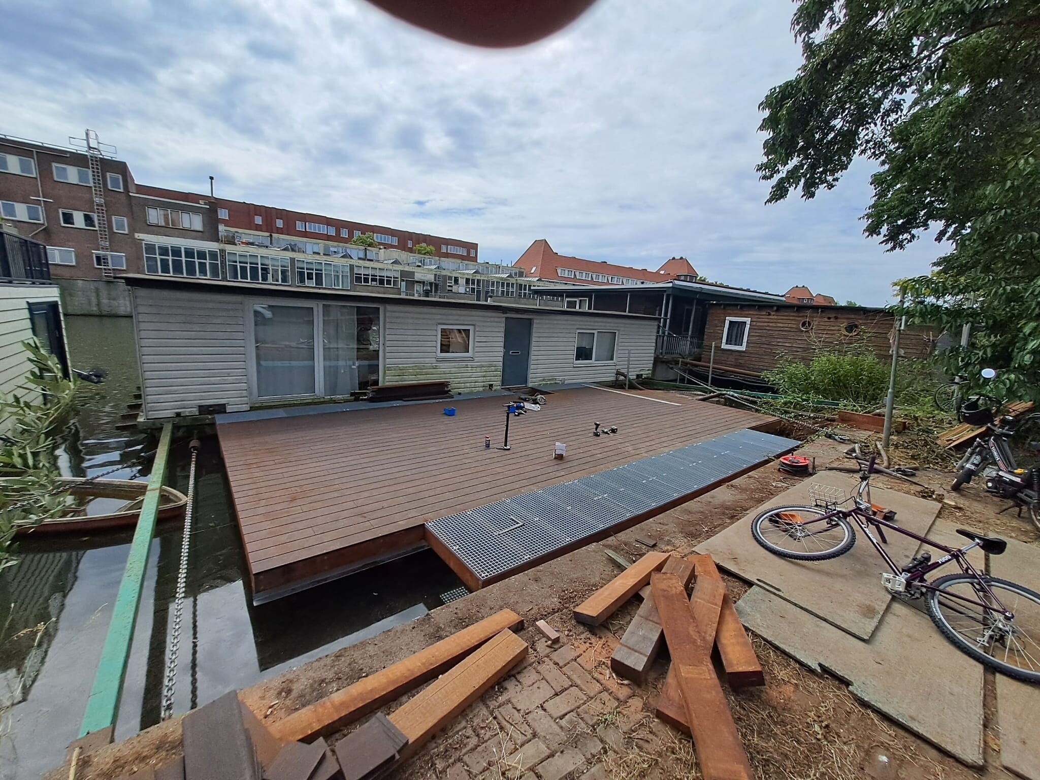 Voor een woonark in Amsterdam vervingen we de bestaande toegangssituatie door een nieuwe, duurzame steiger. De fundering bestaat uit 13 meter lange buispalen, voorzien van stalen balken en hardhouten gordingen. Daarop monteerden we een kunststof dek met bamboe uitstraling – stevig, onderhoudsarm en stijlvol.