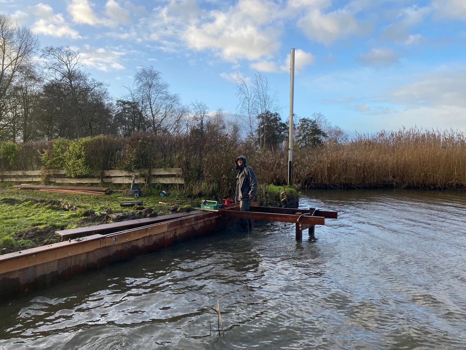 Bij deze klant aan het Veluwemeer was de beschoeiing toe aan vervanging. Wij hebben hier hardhouten damwanden voor geplaatst. De werkzaamheden hebben we uitgevoerd met kleine machines vanwege de bereikbaarheid. Daarnaast wilde de klant nog twee kleine steigers geplaatst om bootjes aan te kunnen leggen.