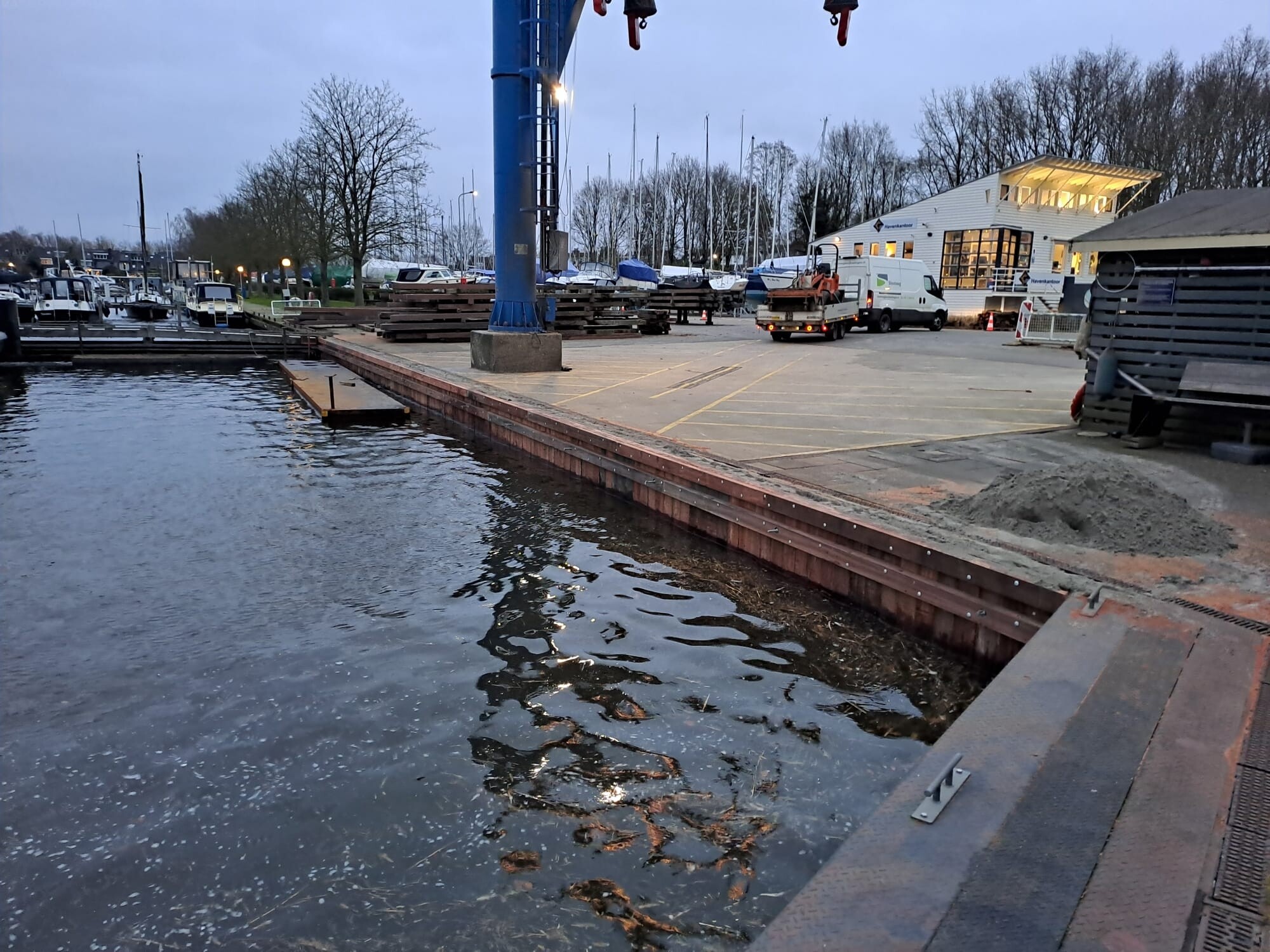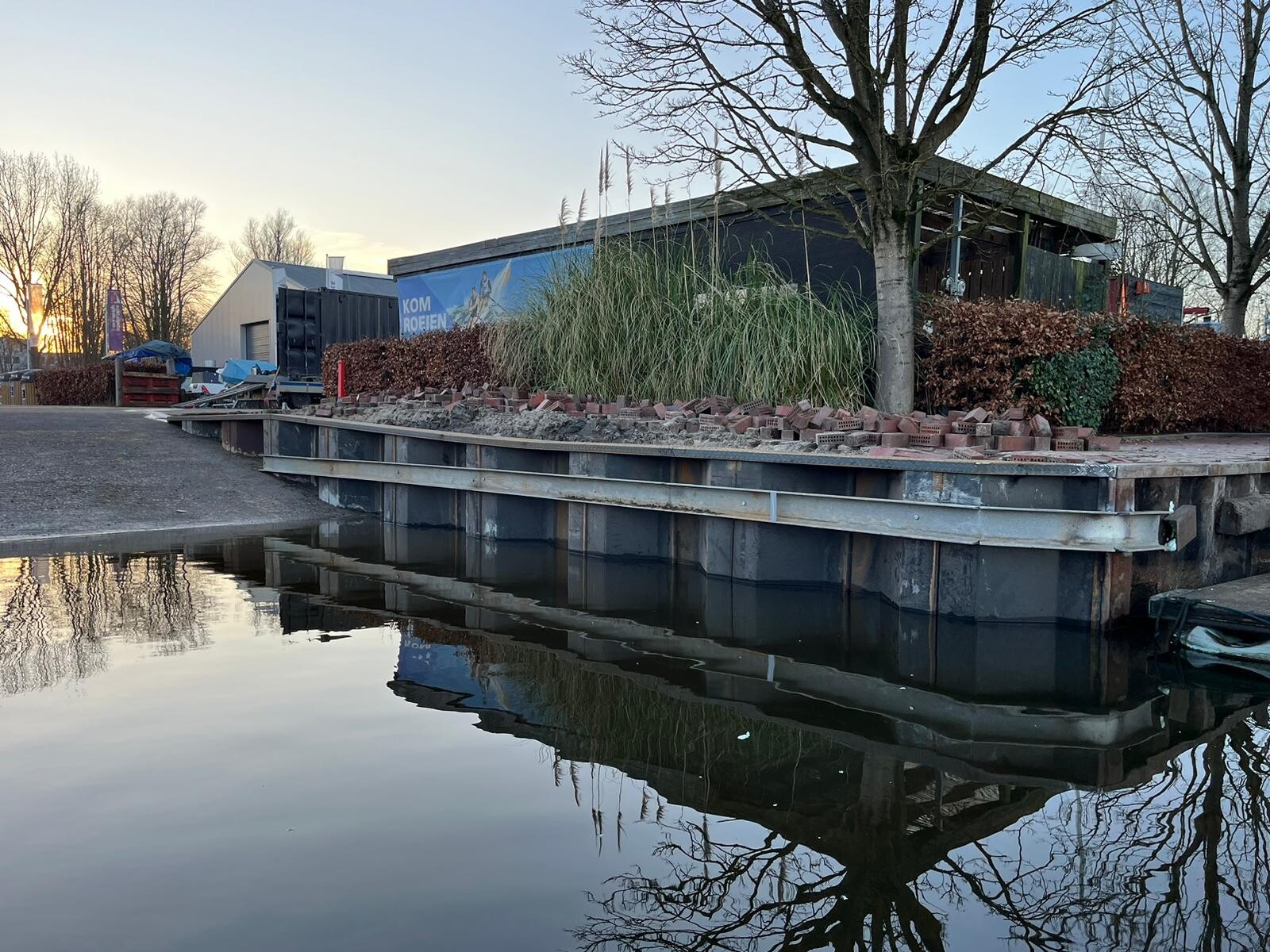 Bij de botenhelling, waar vaartuigen te water worden gelaten, plaatsten we een stalen damwand. Voor de uitvoering is dit deel tijdelijk drooggezet, zodat we veilig en nauwkeurig konden werken.