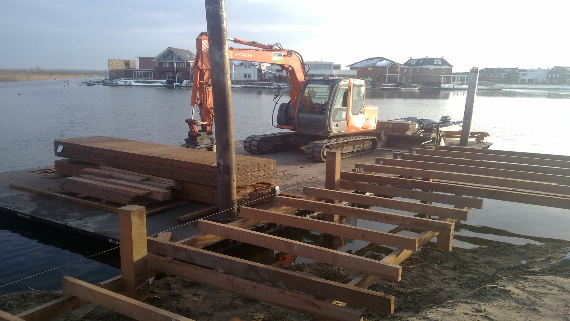 Bij eerdere projecten van Slootweg werd het huis nog wel eens gebouwd nadat de vlonder was geplaatst, maar in dit geval stond het huis er al. Dus moesten alle werkzaamheden vanaf het water gebeuren. Met behulp van pontons werd de kraan en al het materiaal naar de woning gevaren. Vanaf het water kan Slootweg dezelfde werkzaamheden uitvoeren als vanaf het land. Dat kost alleen meer tijd en geld.